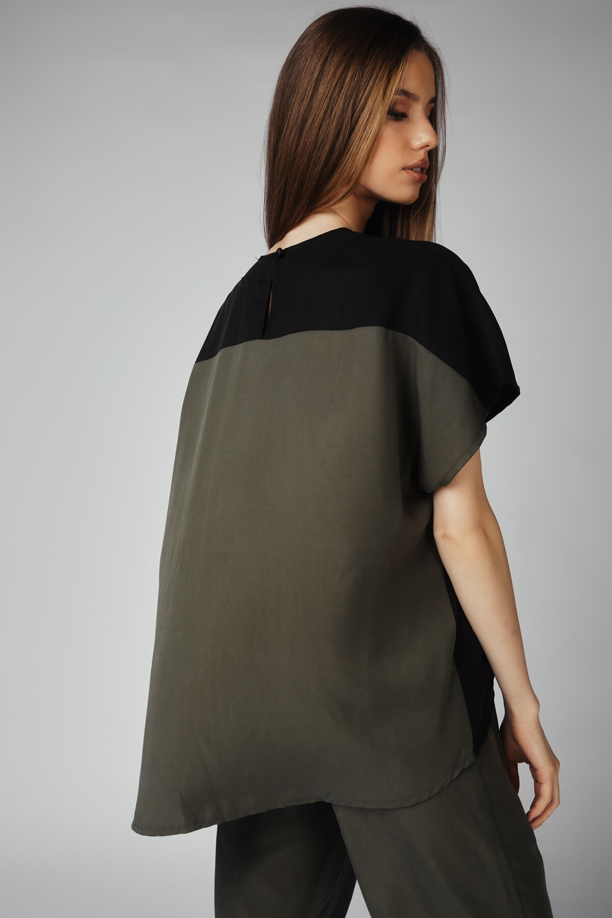 Blouse oversized- asymmetric length- two-tone- a button on the back