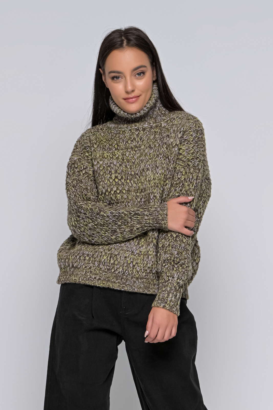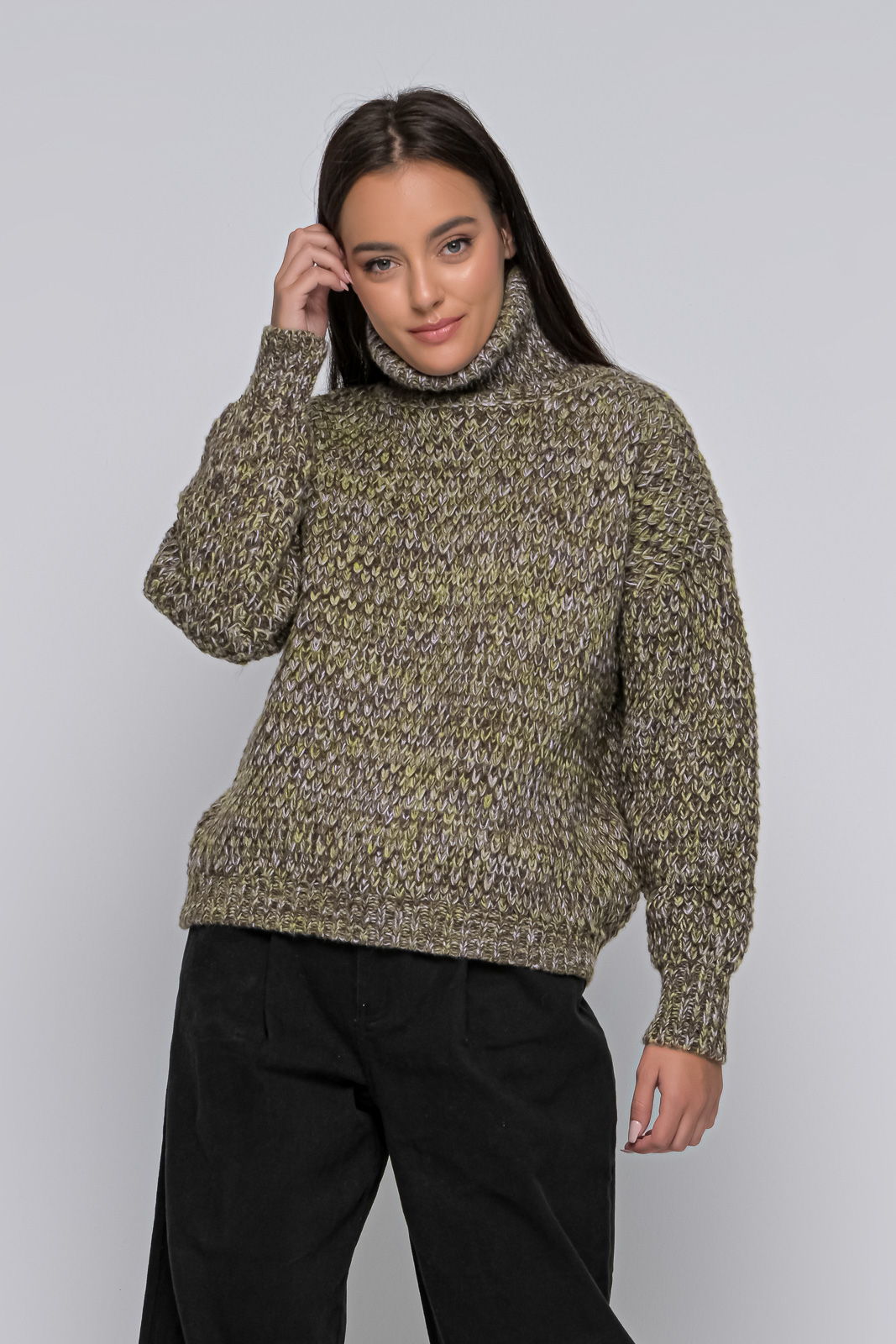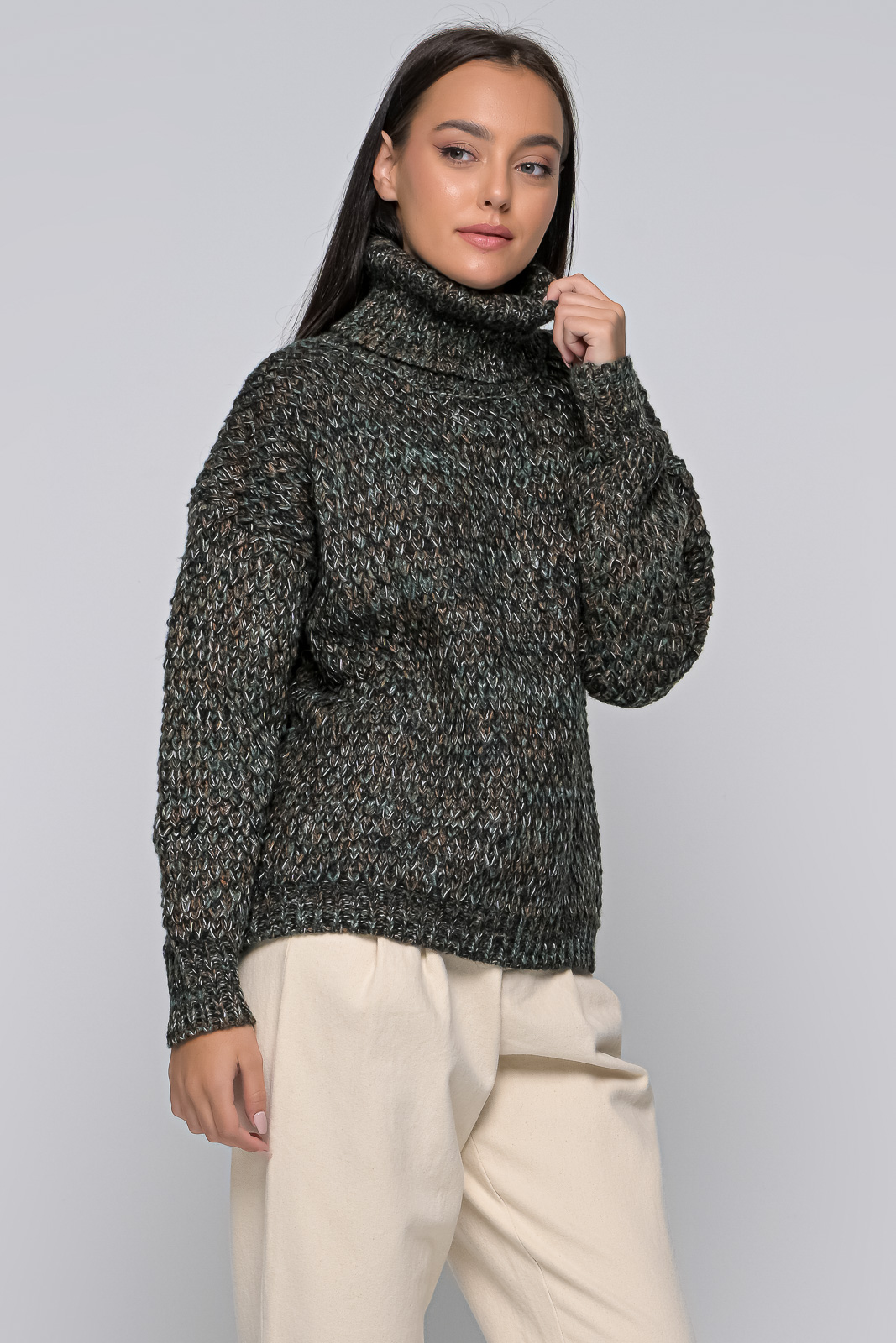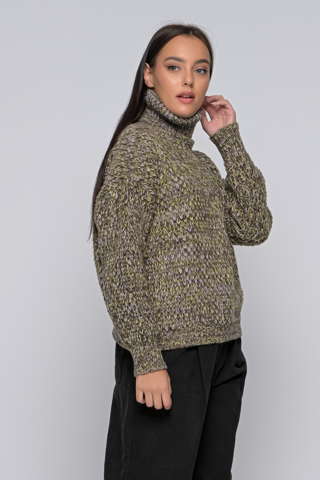 Knitted sweater, turtleneck, with rubber at the bottom, of medium length.