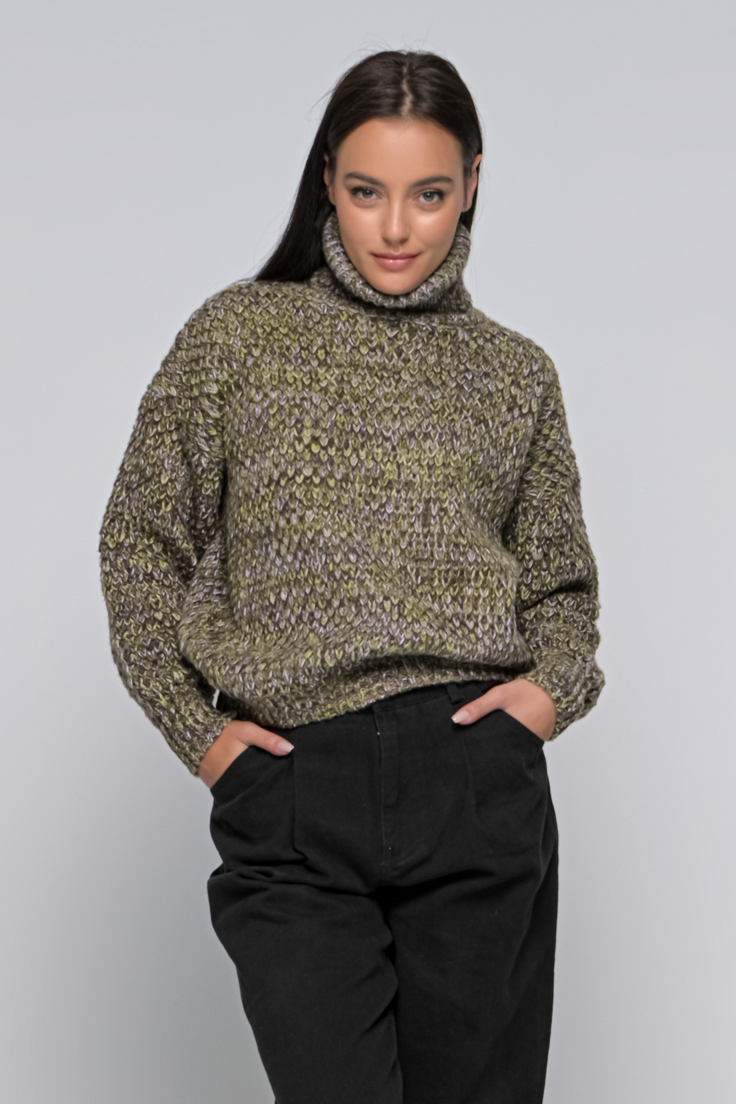 Knitted sweater, turtleneck, with rubber at the bottom, of medium length. The model is 1.68 and wears an S/M. 100% POLYESTER