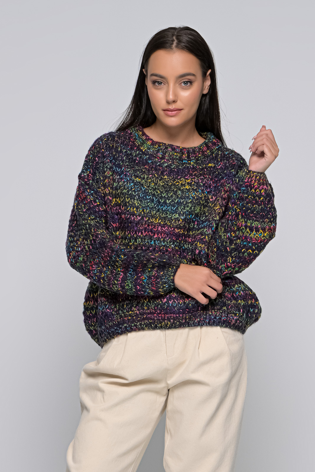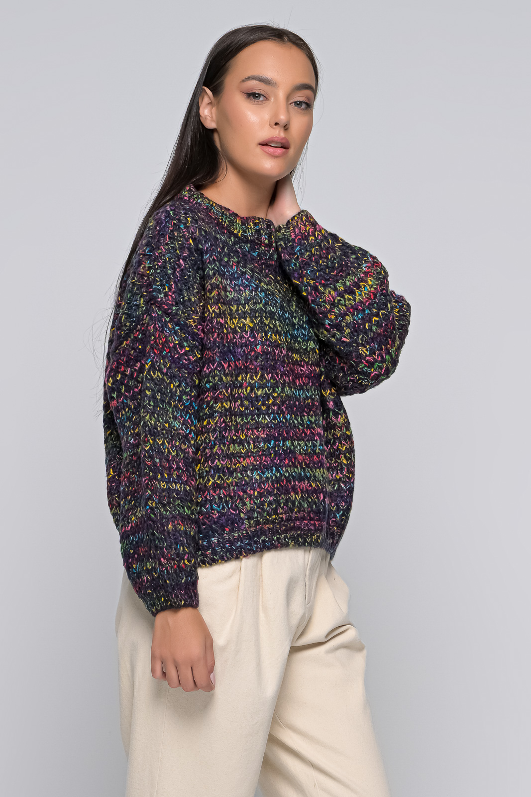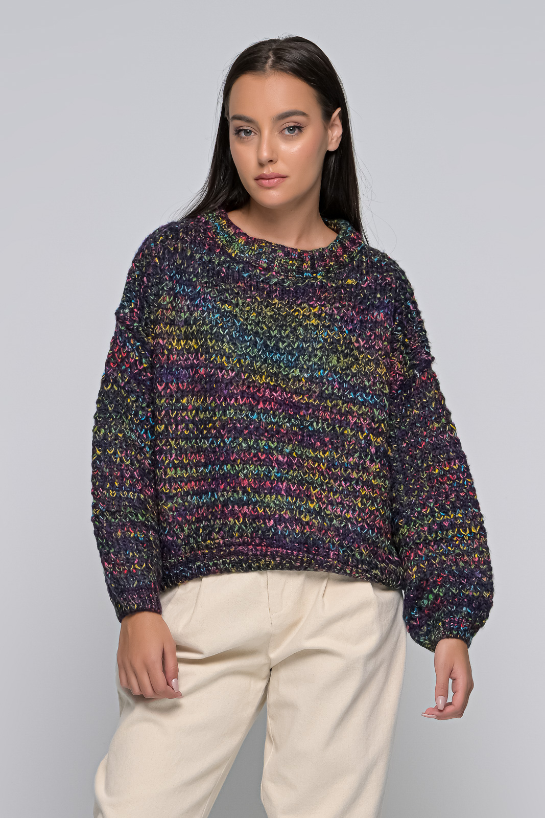 Knitted sweater, neckline, rubber on the sleeves and waist. The model is 1.68 and wears an S/M. 100% ACRYLIC