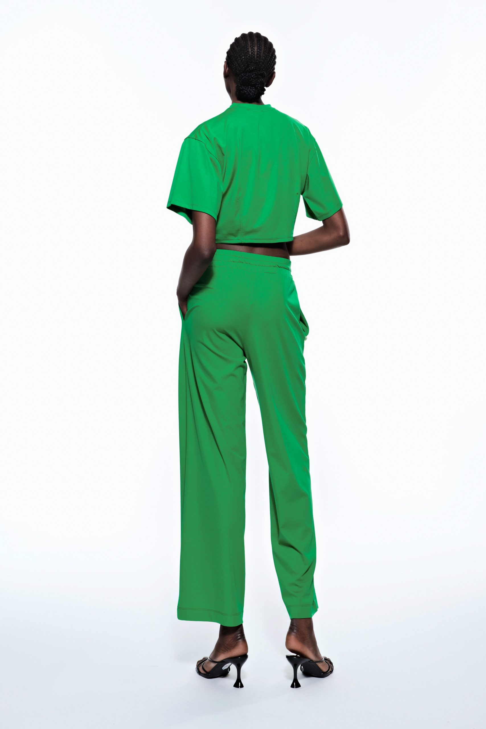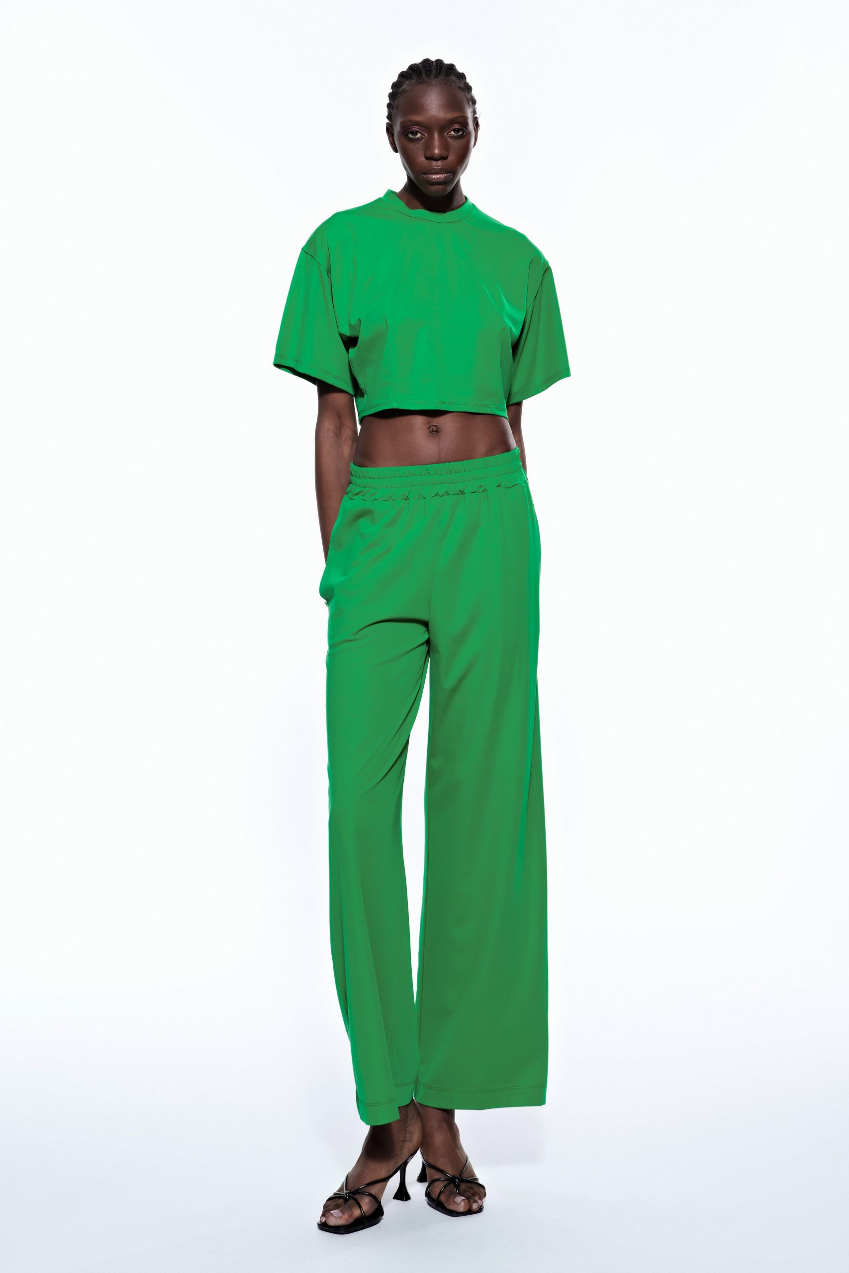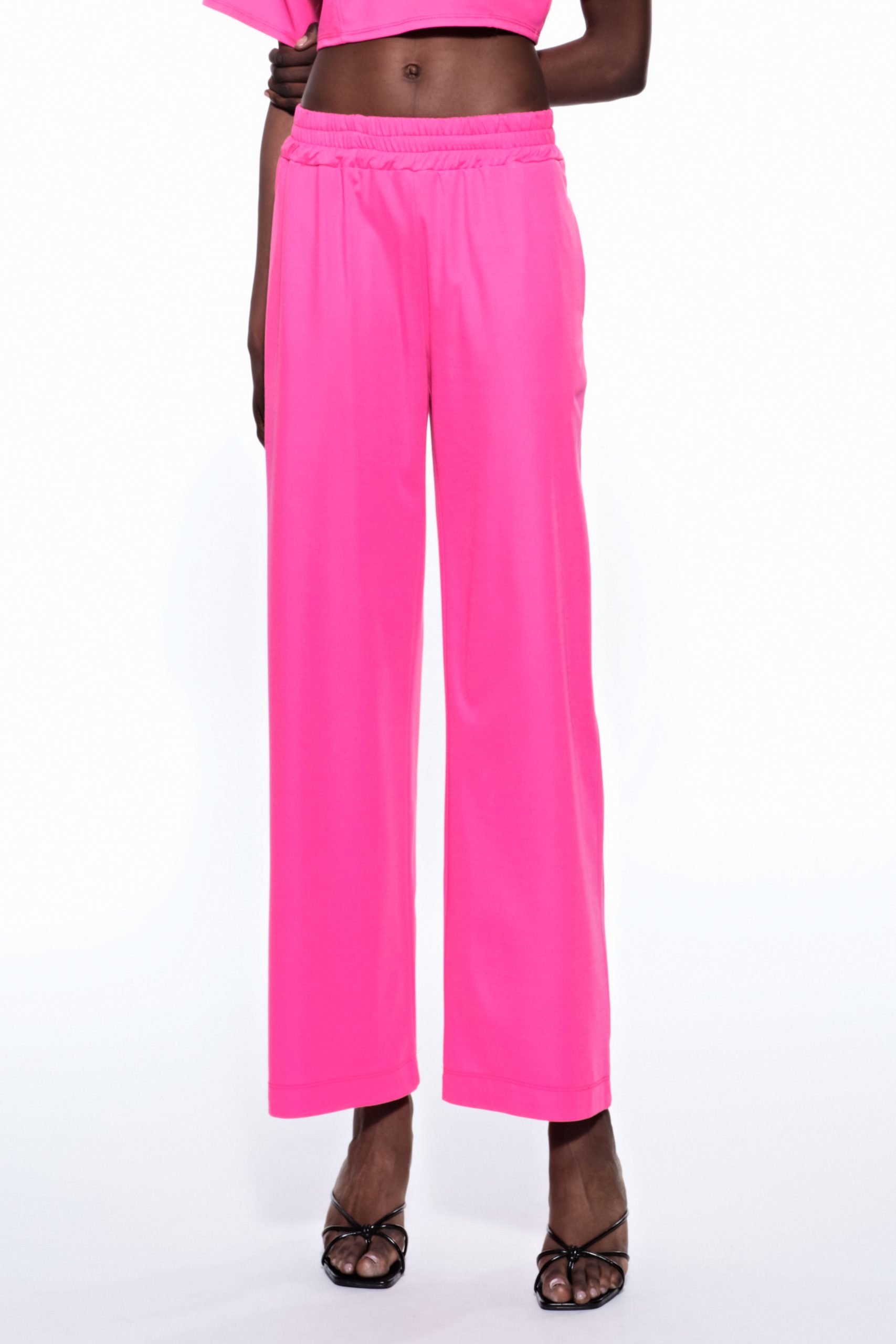 Wide trousers with rubber in the middle. Made of elastic fabric.