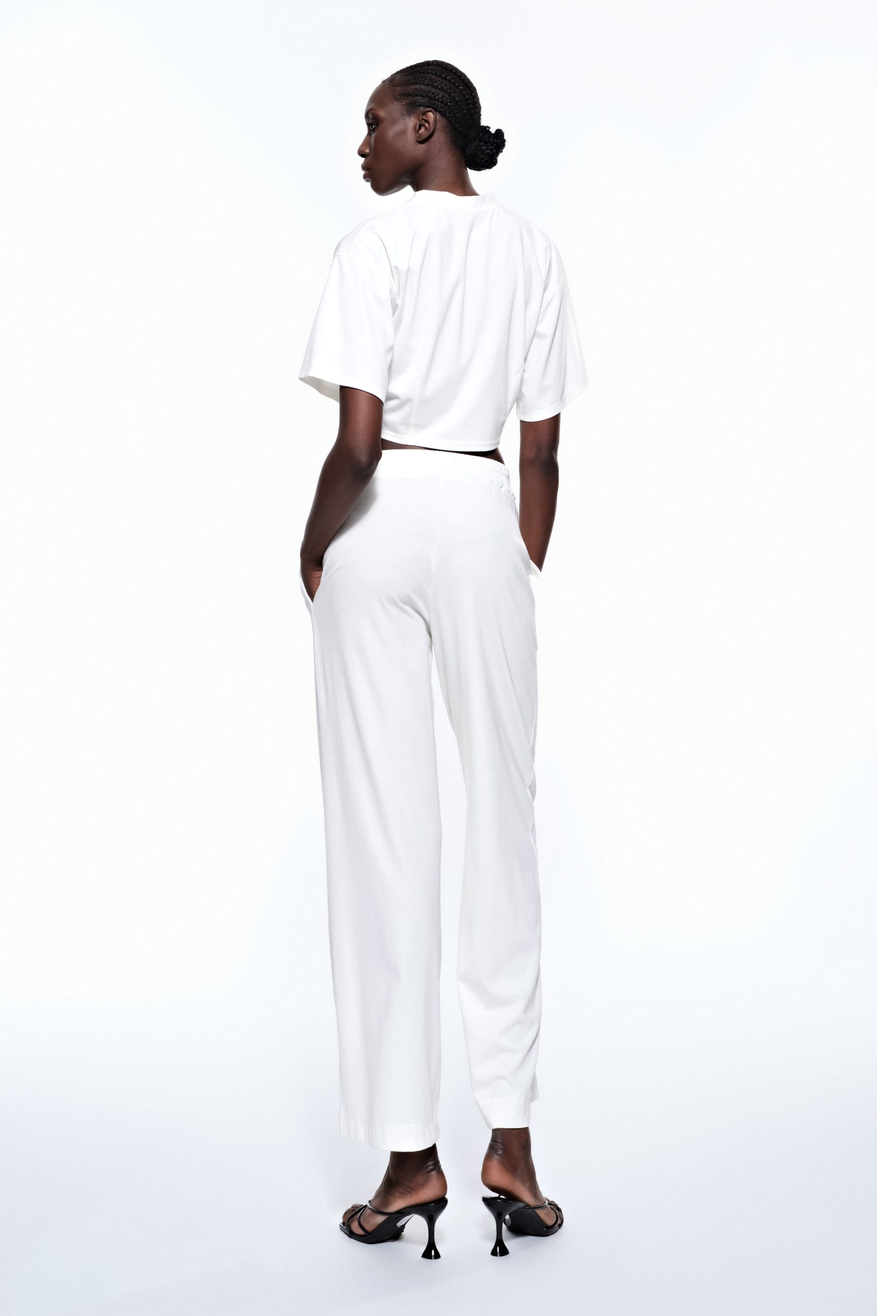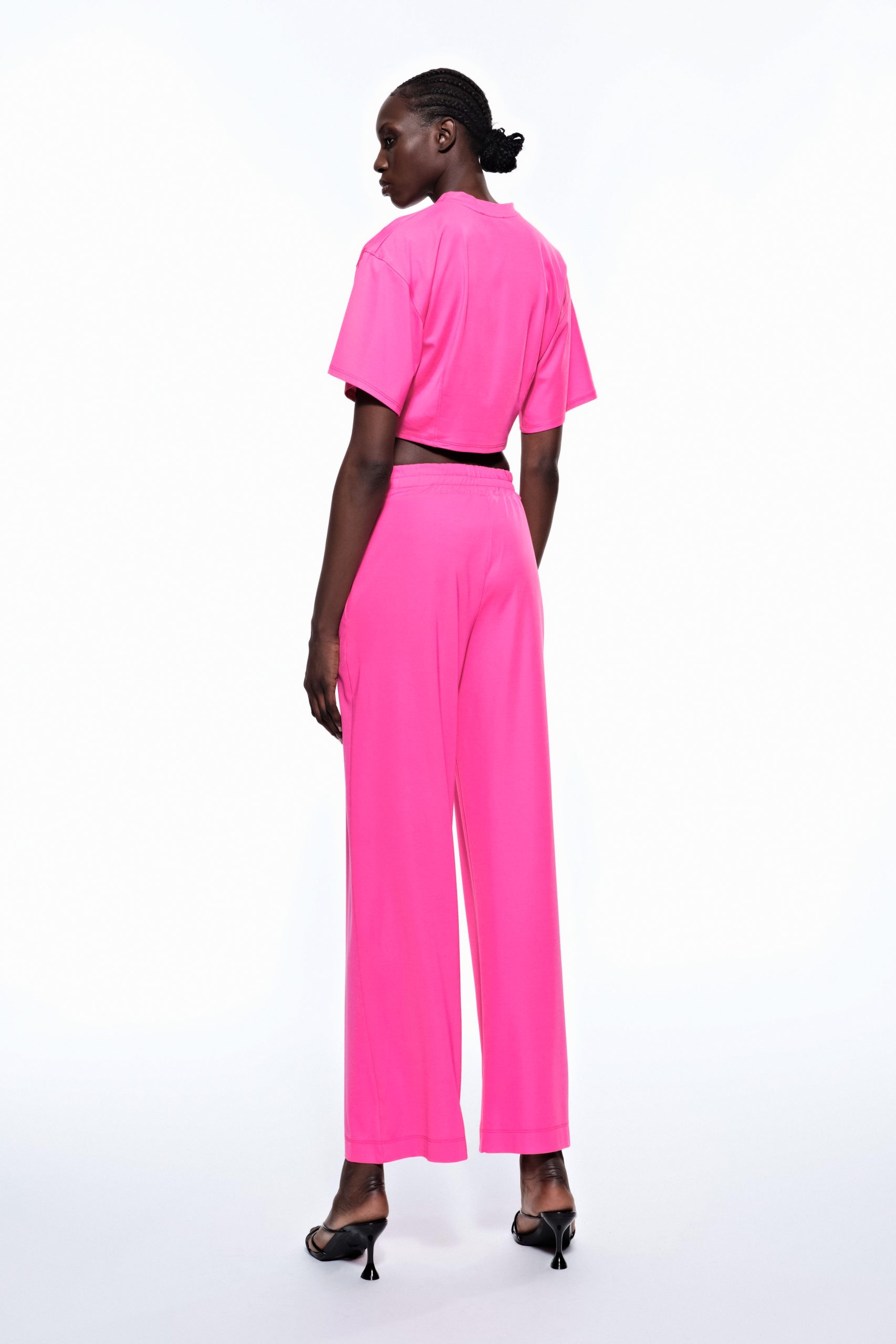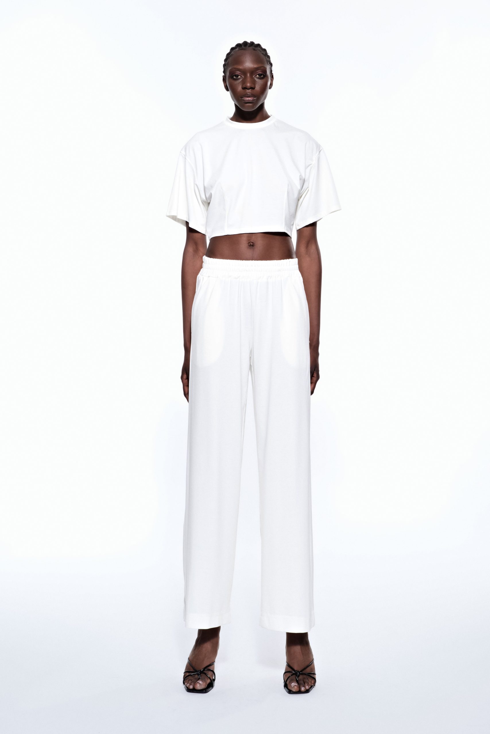 Wide trousers with rubber in the middle. Made of elastic fabric.