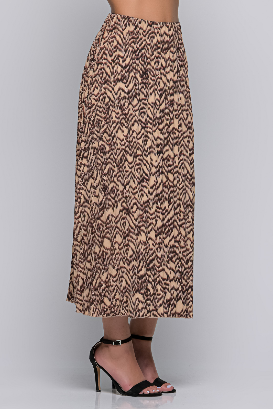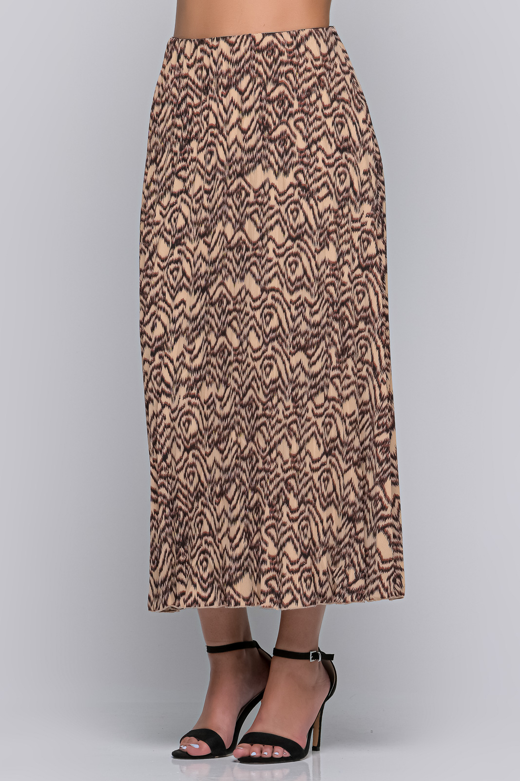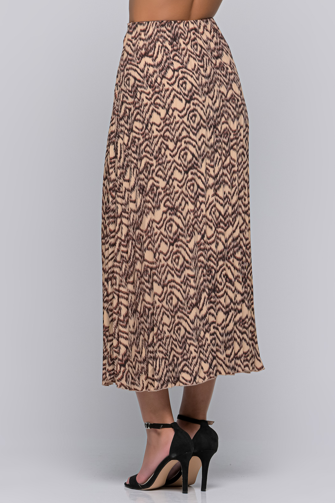 Φούστα μακριά με πιέτες, λάστιχο στη μέση και πλαϊνό φερμουάρ.