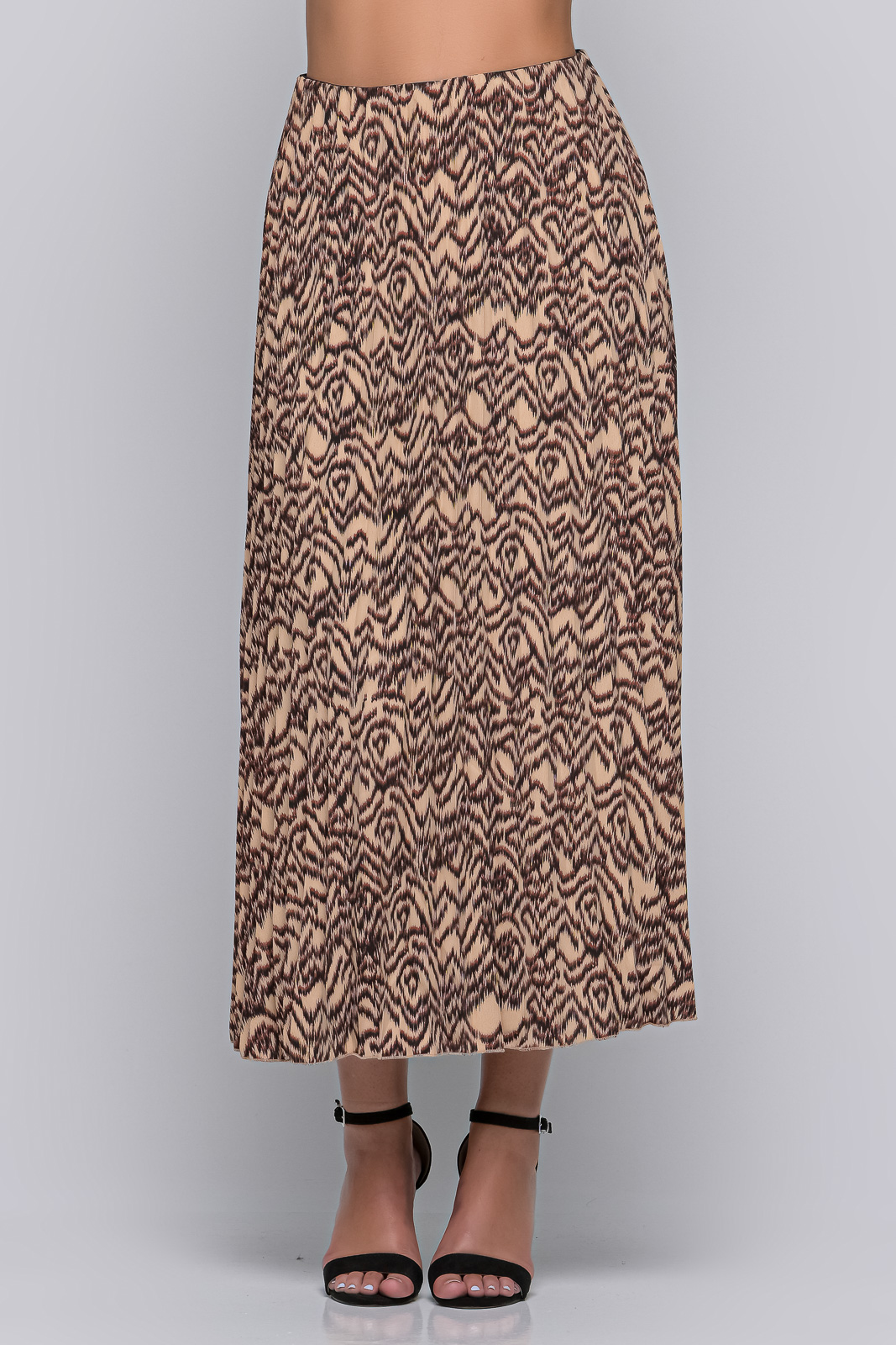 Φούστα μακριά με πιέτες, λάστιχο στη μέση και πλαϊνό φερμουάρ. Το μοντέλο είναι 1.68 και φοράει small. 100% ΠΟΛΥΕΣΤΕΡ