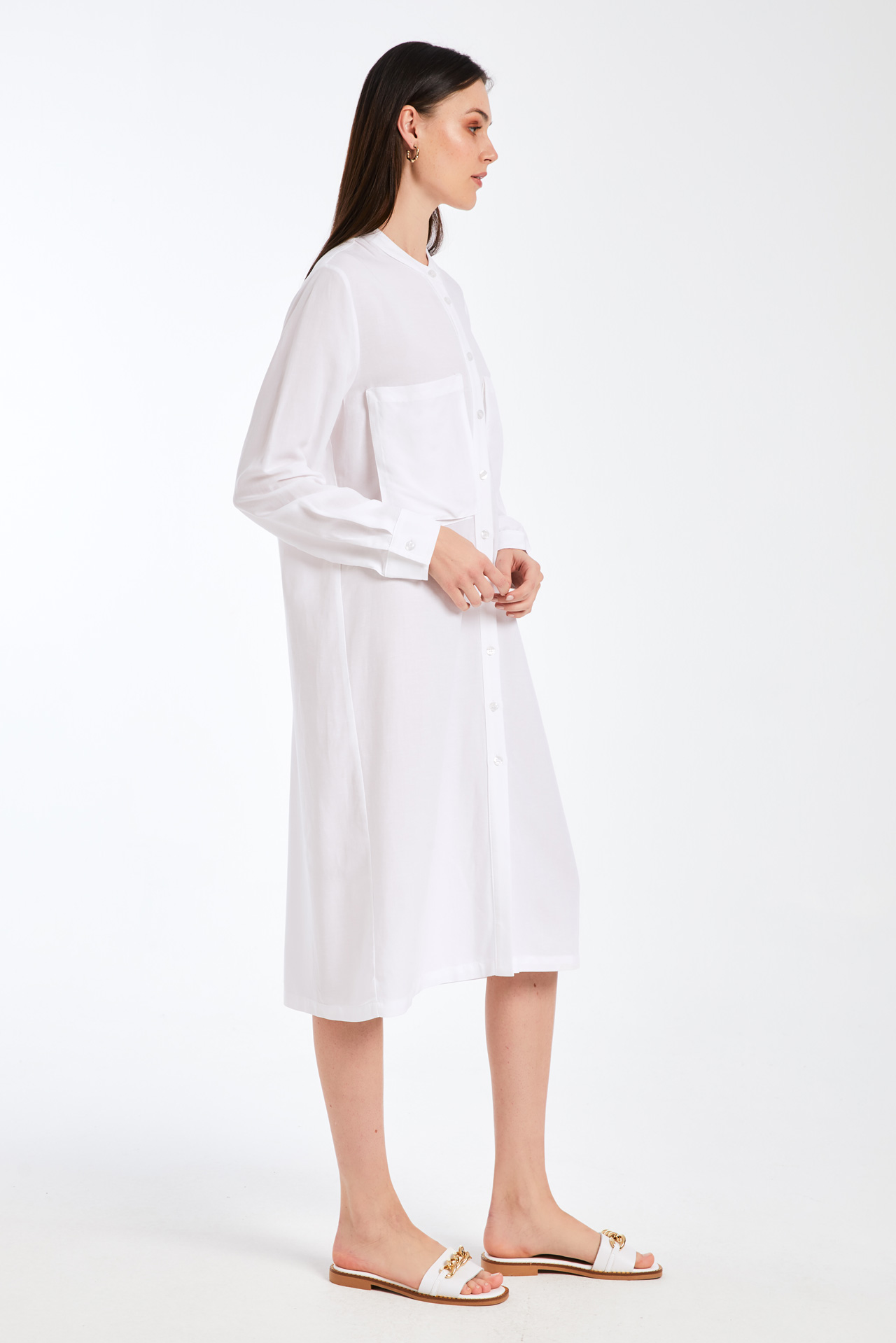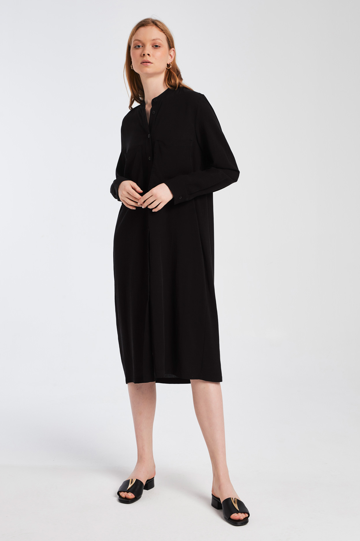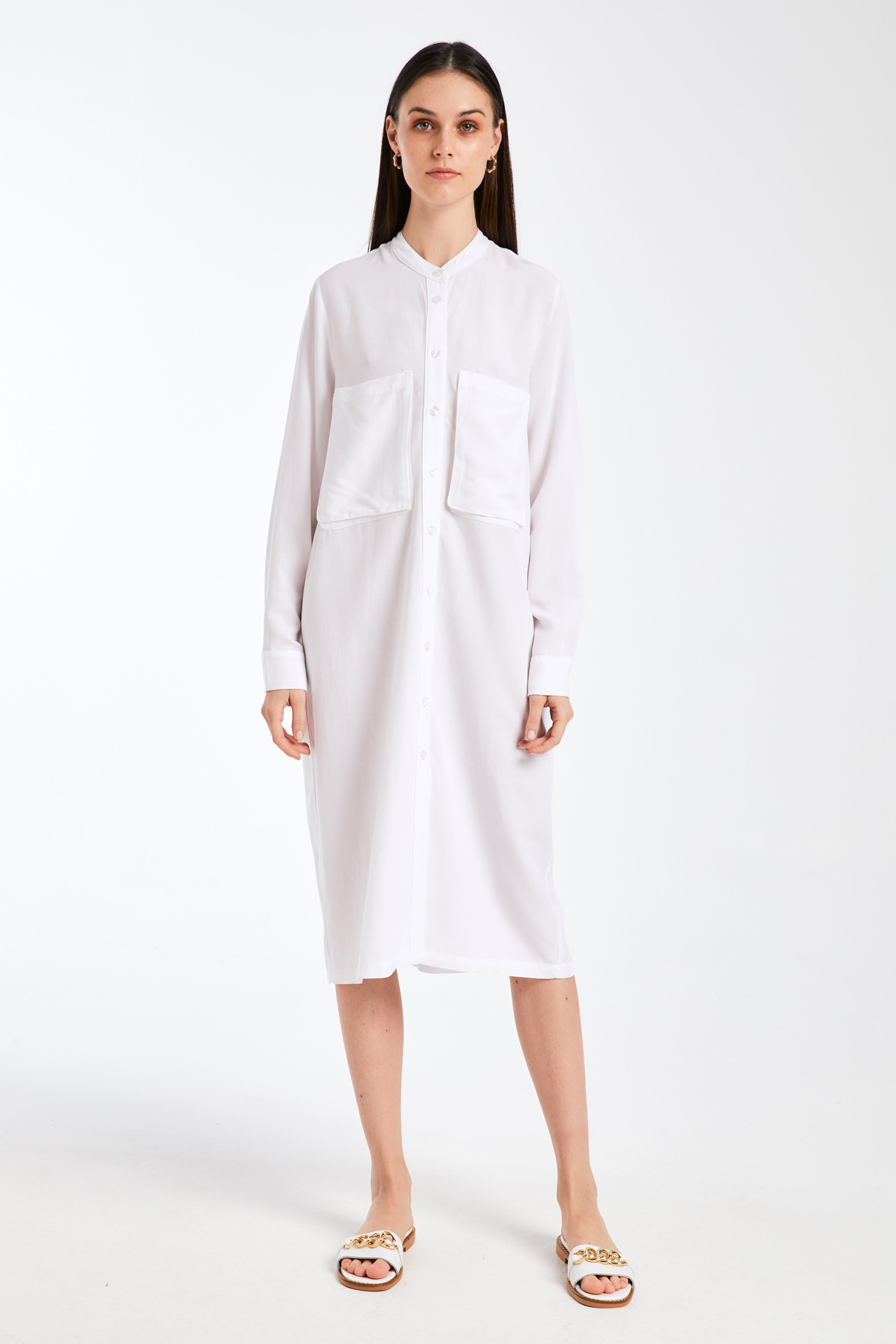 Πουκαμισοφόρεμα, Μακρύ μανίκι με μανσέτα, Μάο γιακάς, 2 τσέπες στο στήθος, Κλείσιμο εμπρός με 10 κουμπιά,