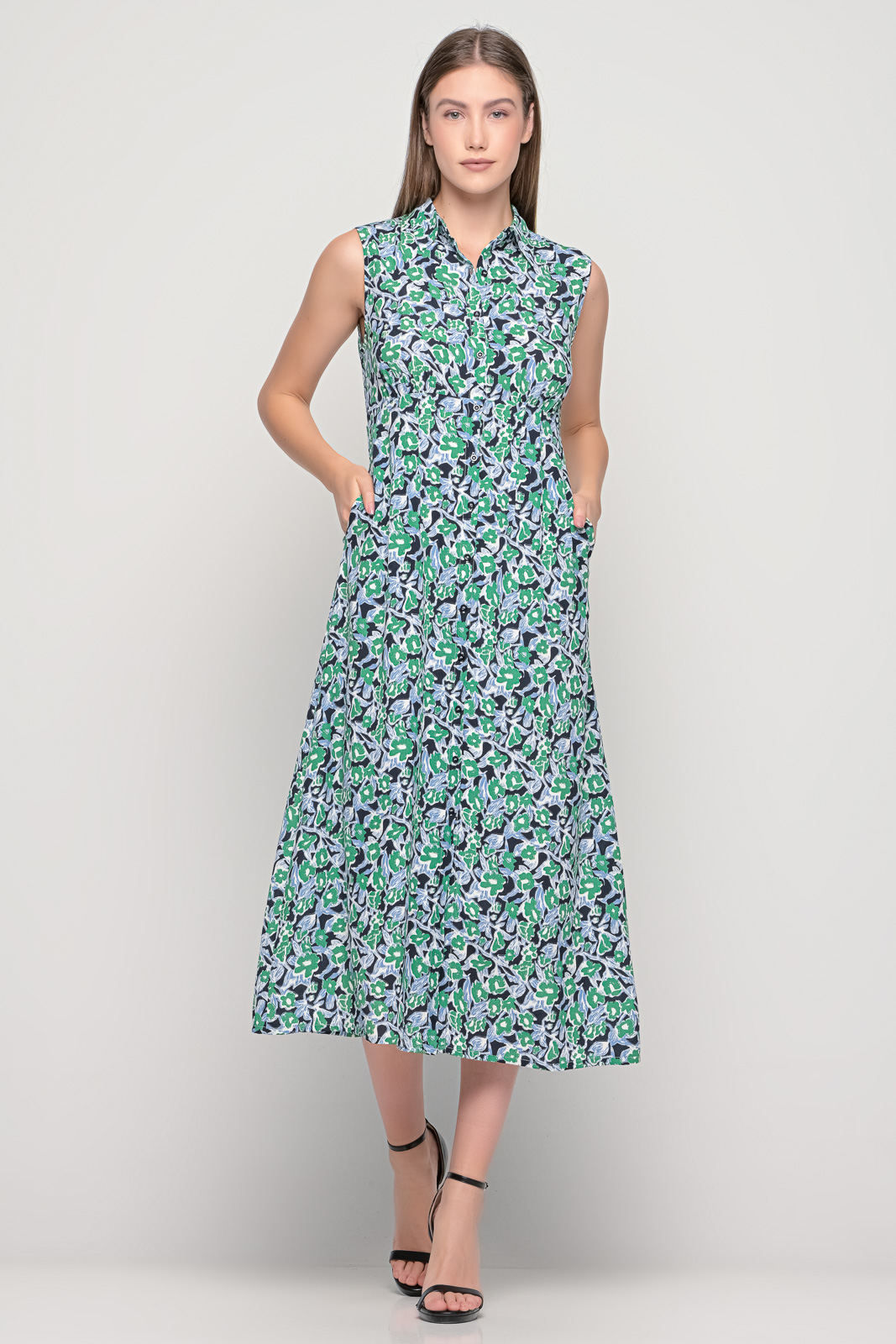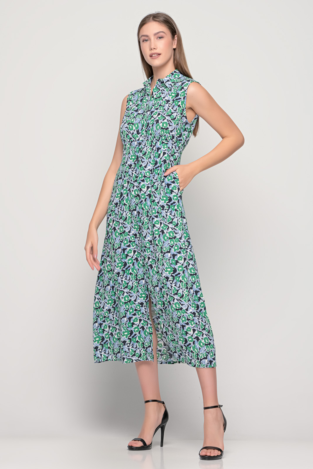 Αμάνικο μακρύ φόρεμα κρεπ, με κουμπιά.