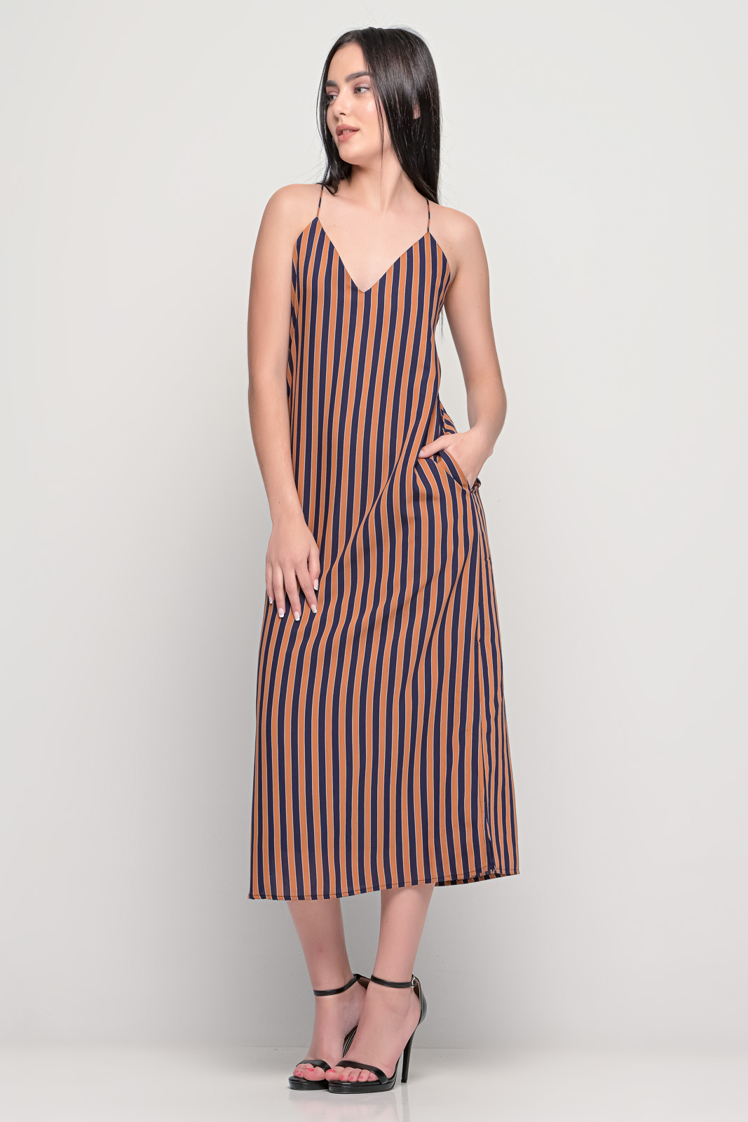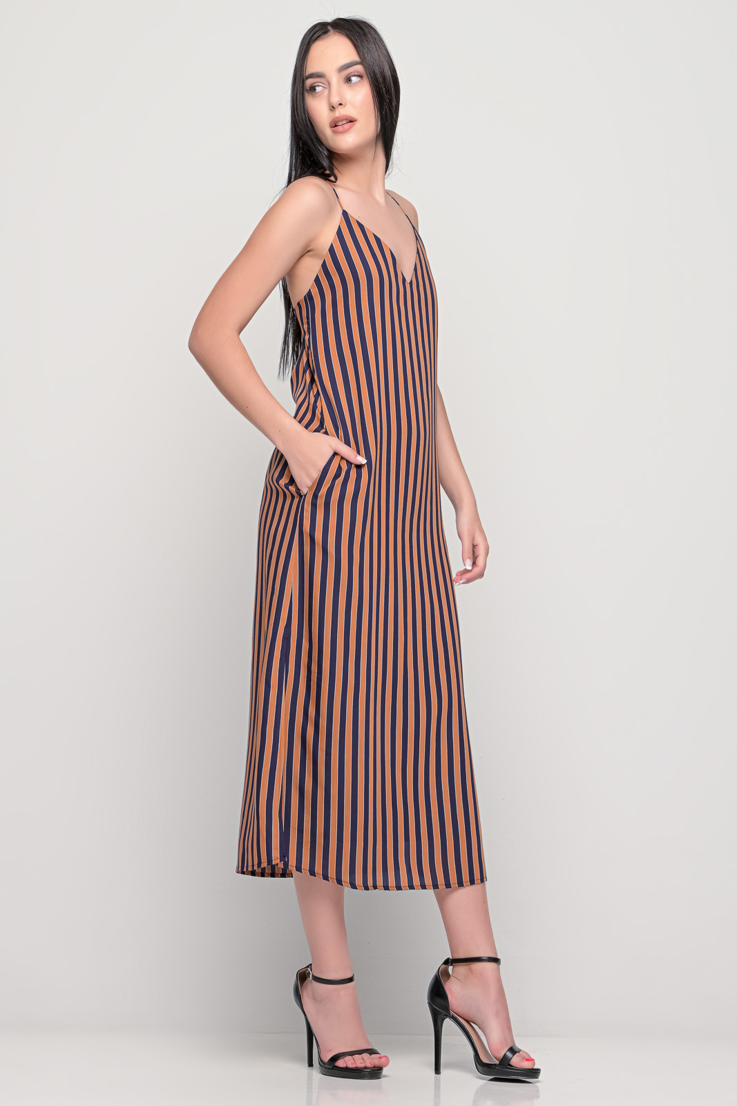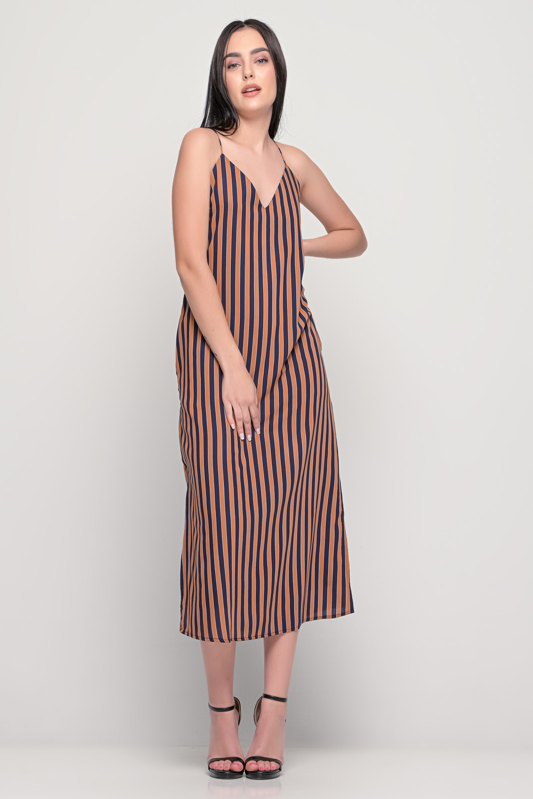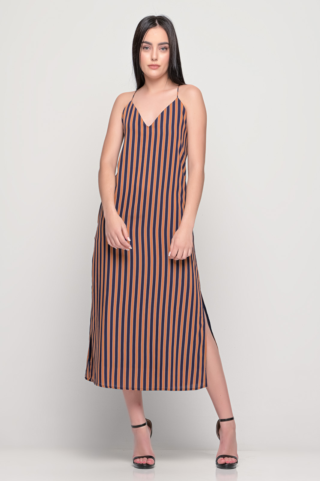 Φόρεμα μακρύ με μεταξωτή υφή, λεπτές ράντες χιαστή στη πλάτη.