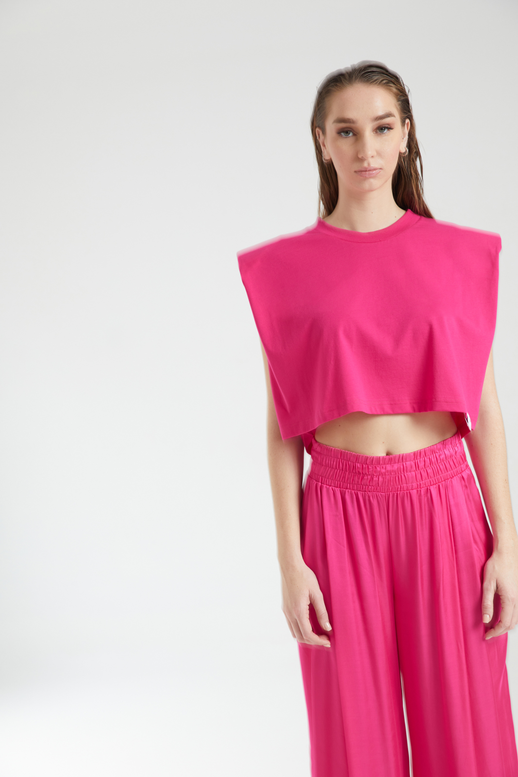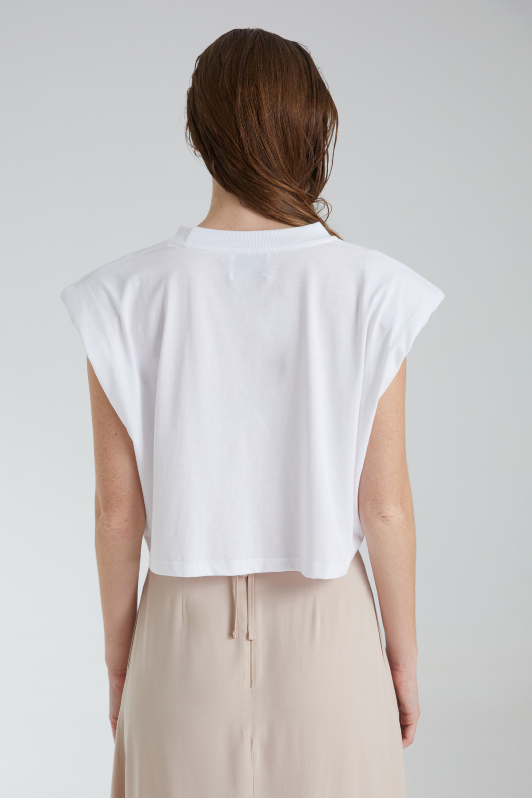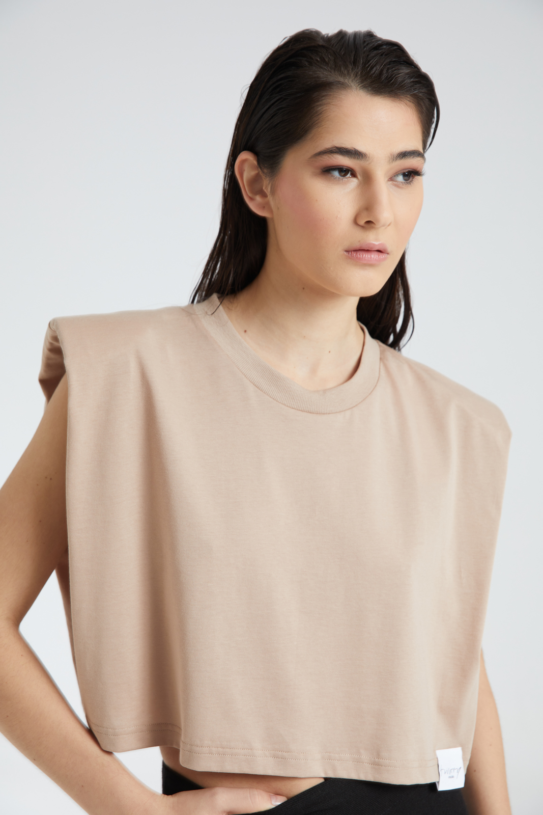 Το Rhea Cropped T-Shirt με βάτες στους ώμους, αποτελεί την τέλεια ισορροπία μεταξύ άνεσης και στυλ, προσφέροντας μια φρέσκια εκδοχή της σύγχρονης κομψότητας.