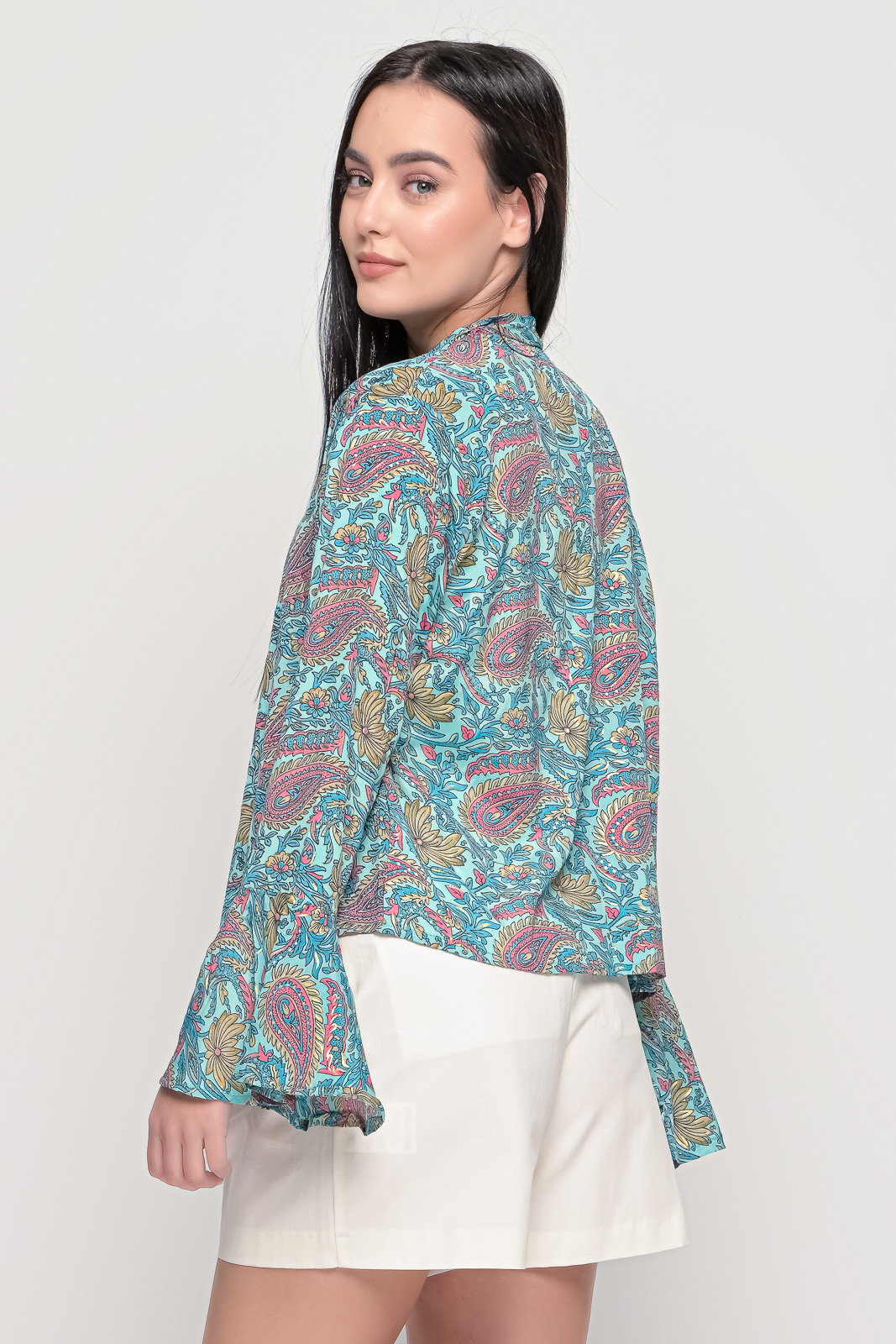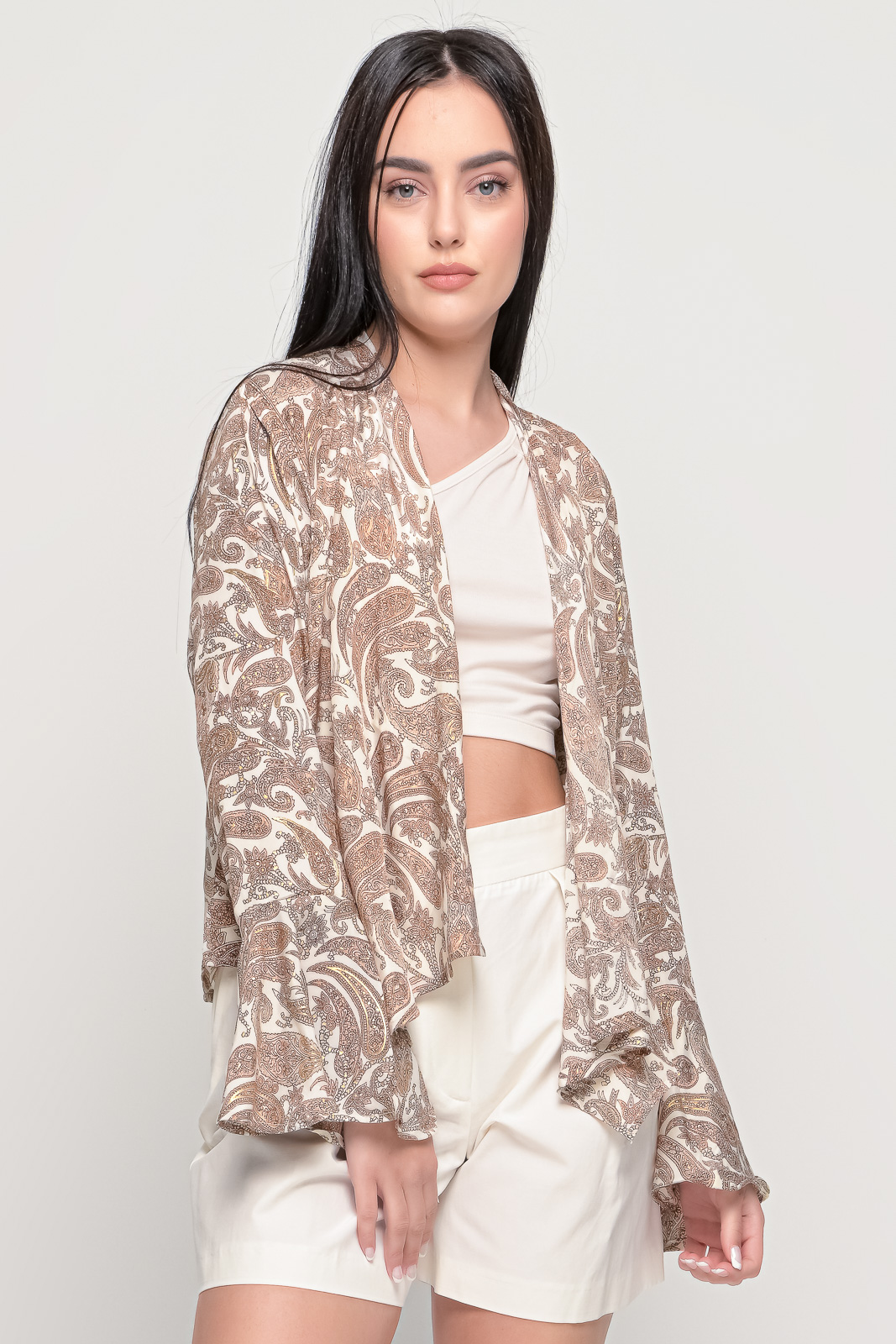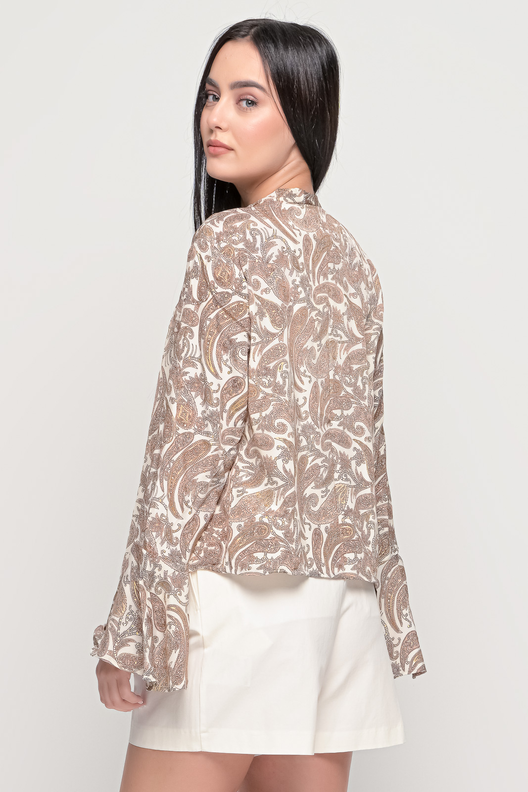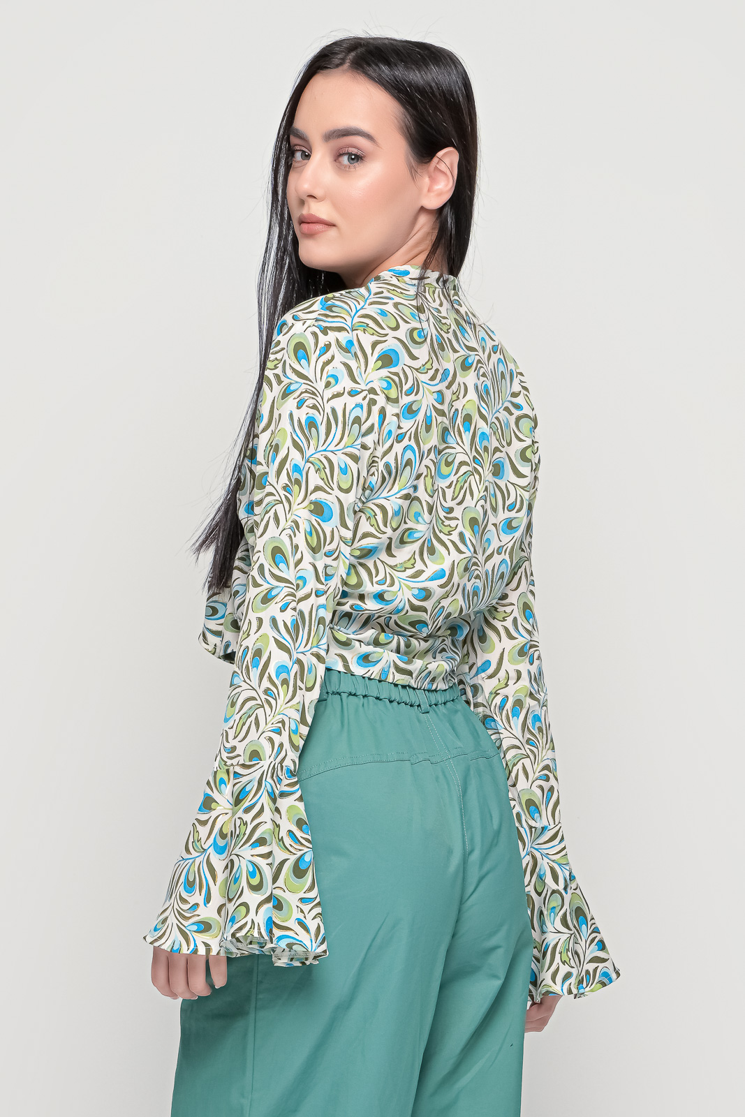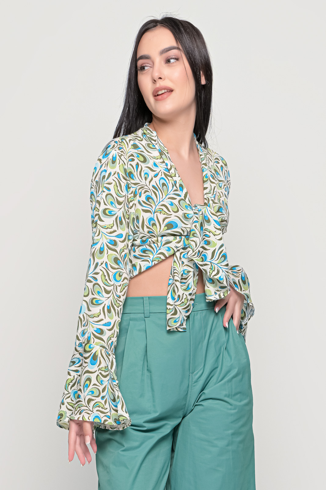 Εμπριμέ πουκάμισο, ριχτό χωρίς κουμπιά με βολάν στα μανίκια.