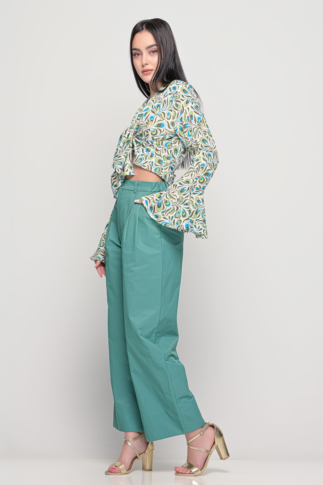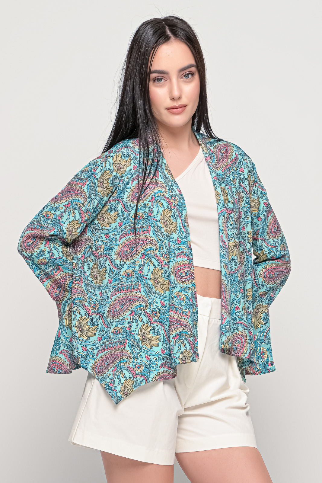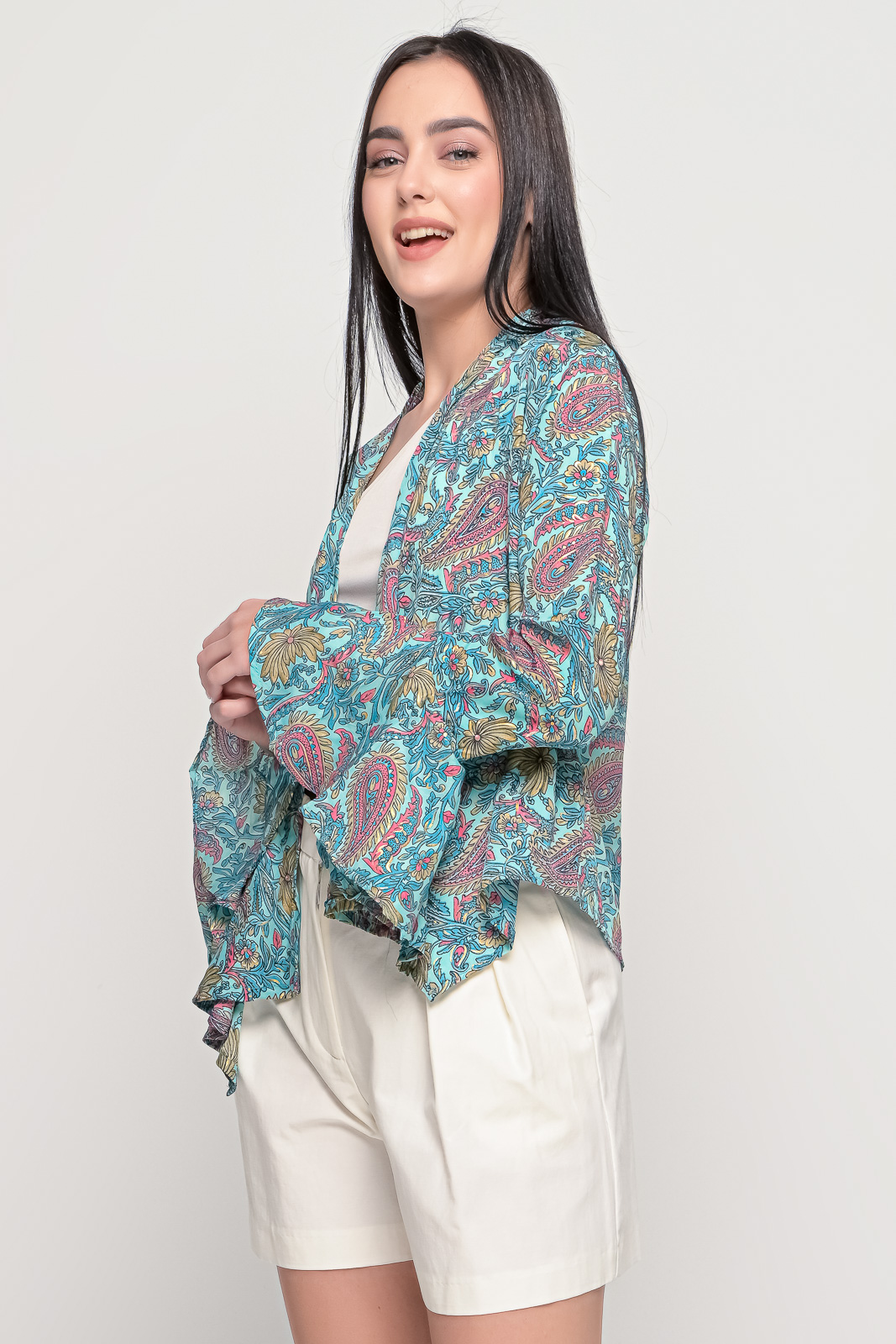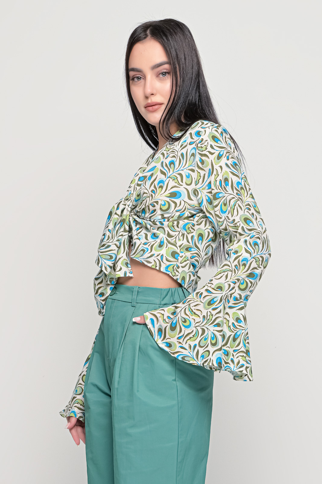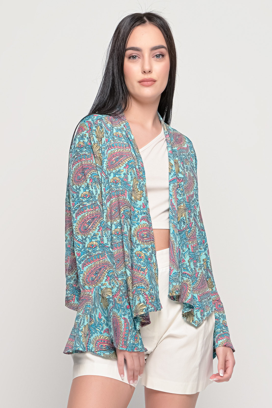 Εμπριμέ πουκάμισο, ριχτό χωρίς κουμπιά με βολάν στα μανίκια.