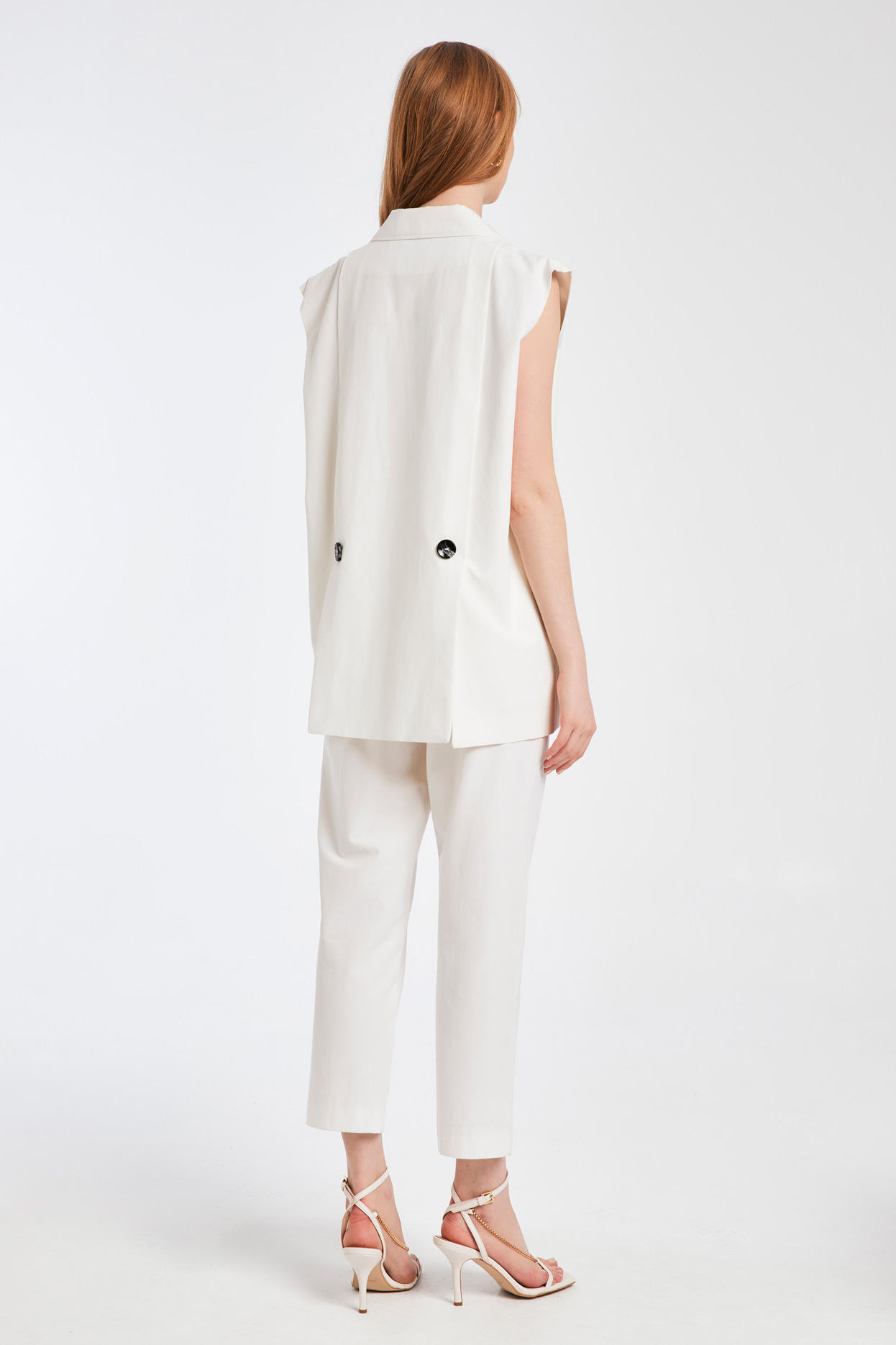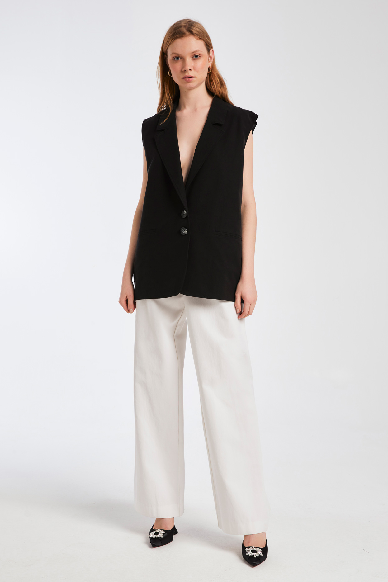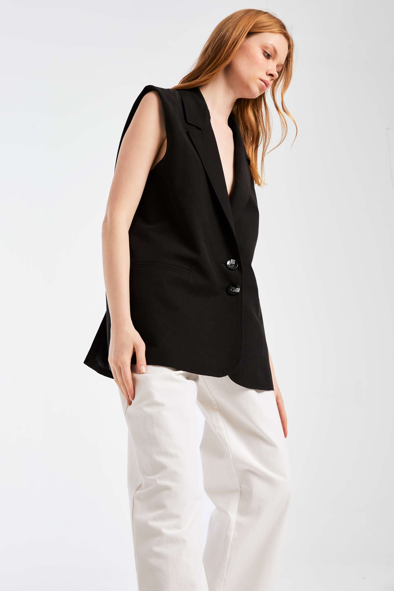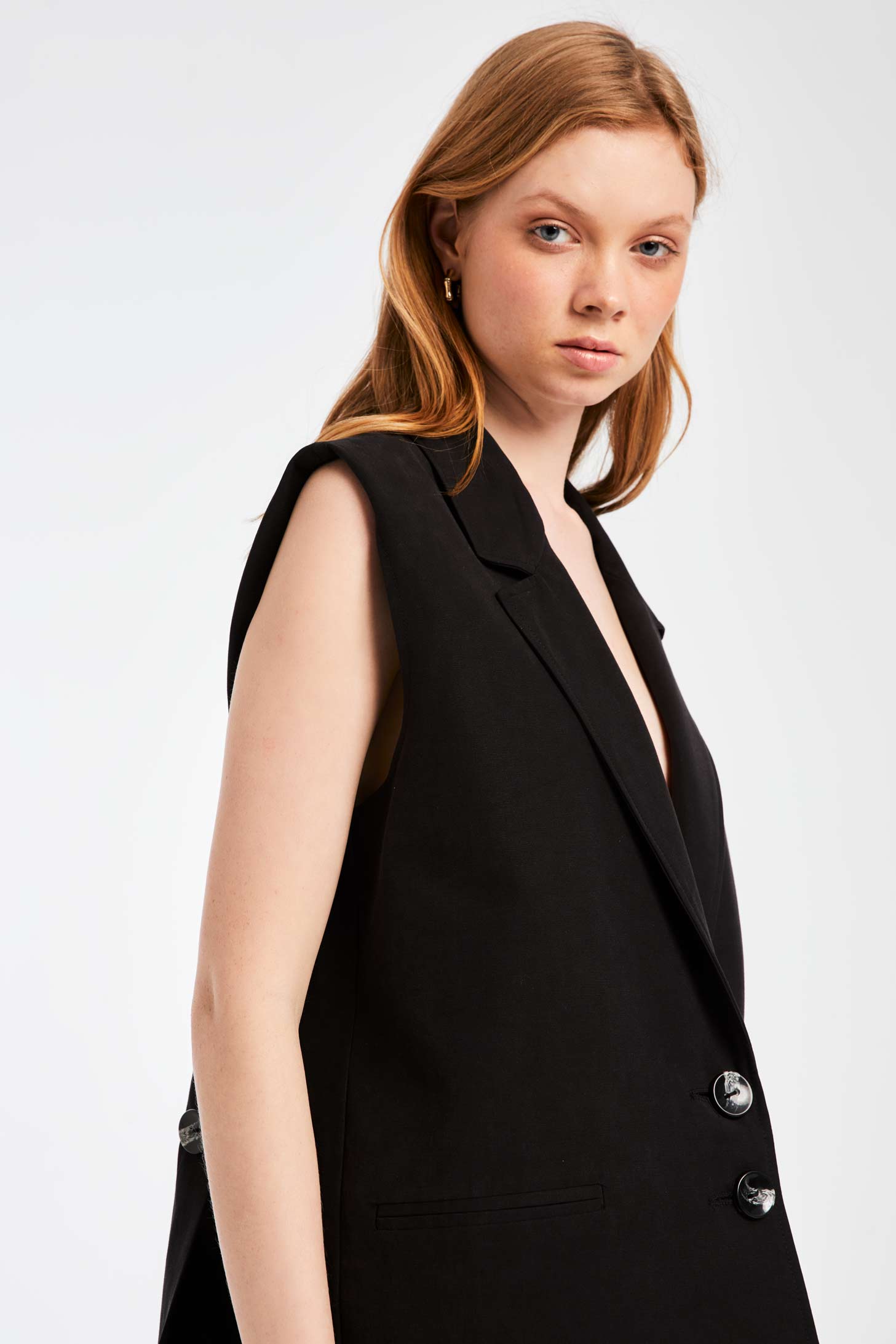 Μακρύ γιλέκο, Γιακάς και πέτα, 2 τσέπες εμπρός, Κλείσιμο εμπρός με δύο κουμπιά, Λεπτομέρεια με 2 κουμπιά στο πίσω μέρος και σκίσιμο,
