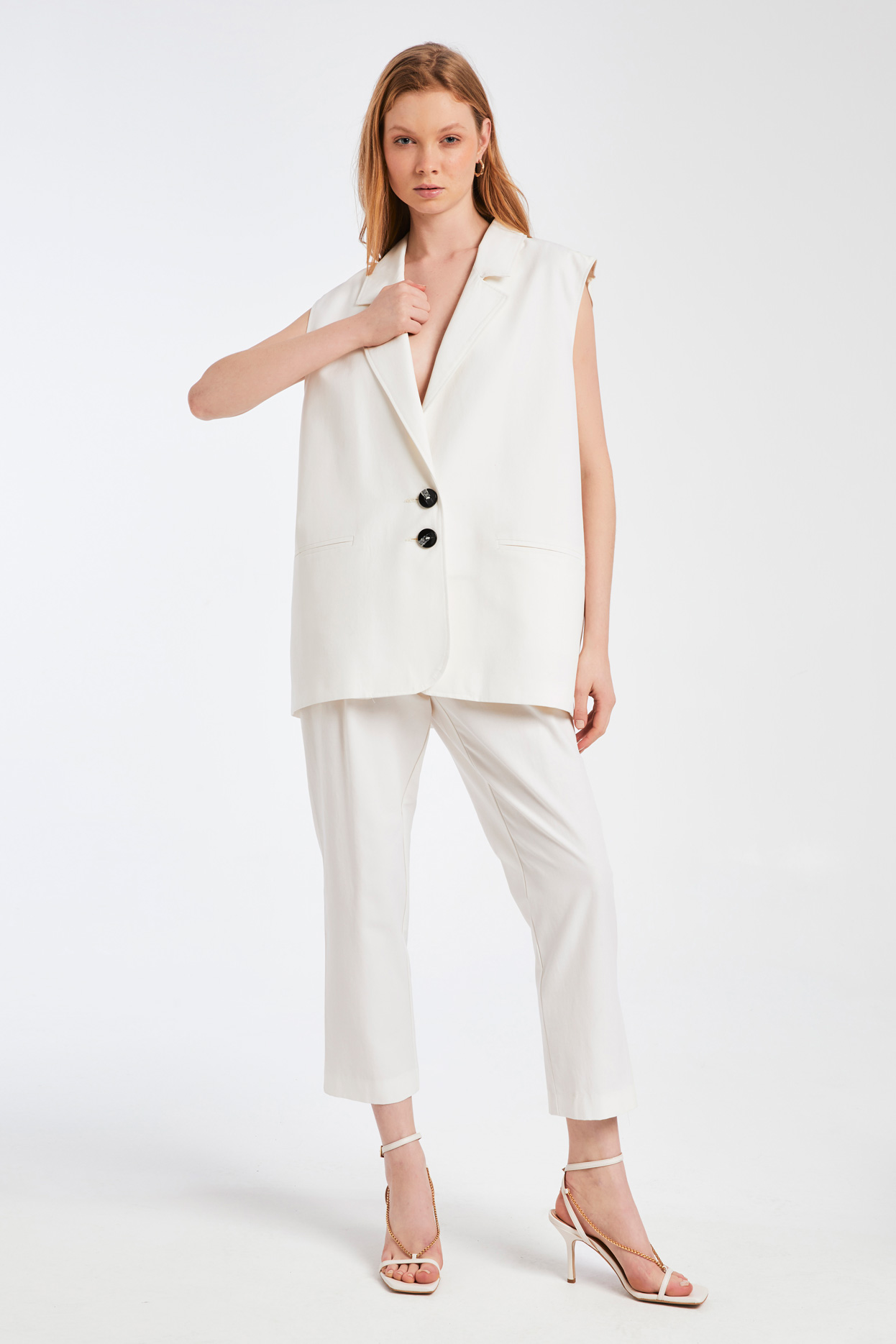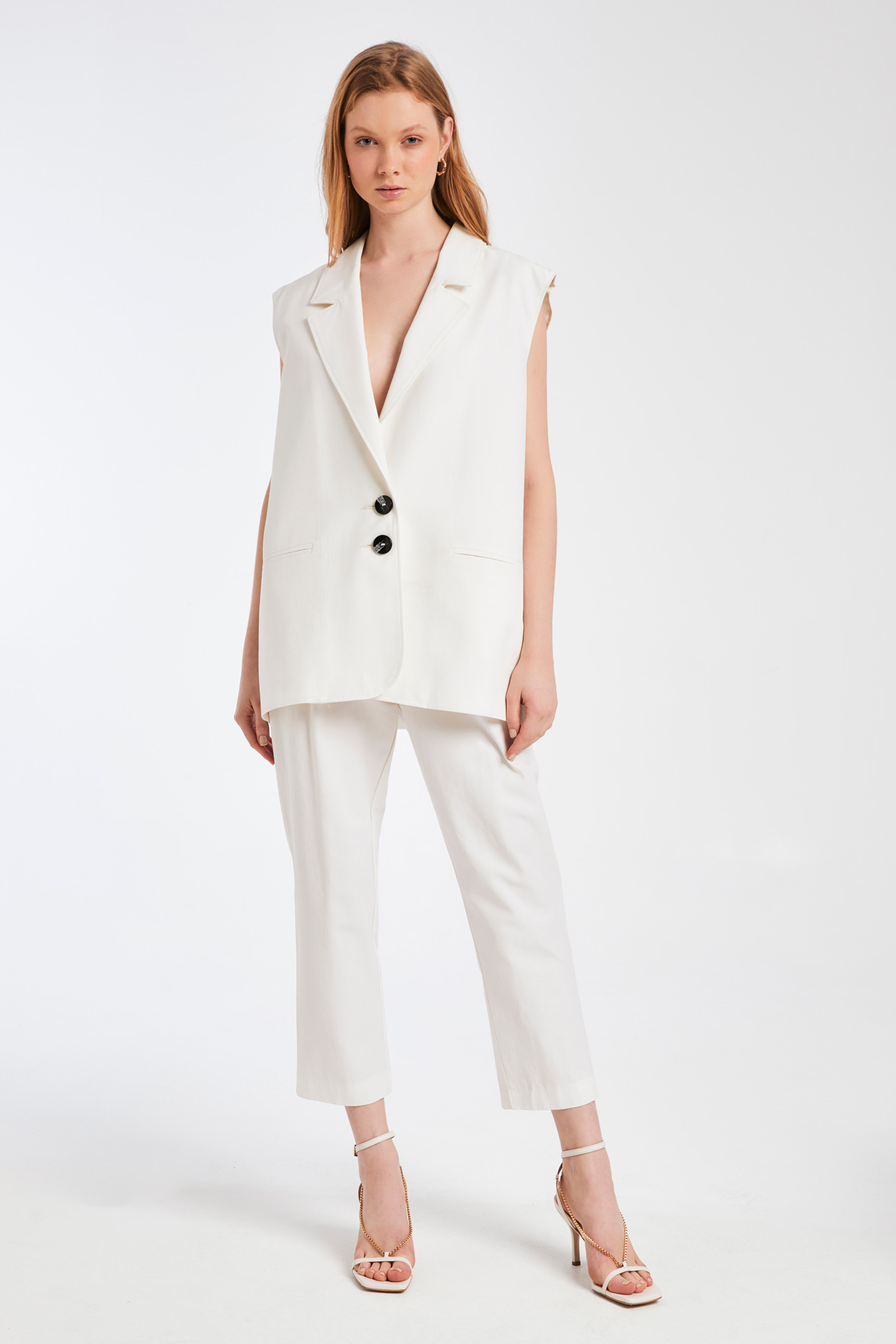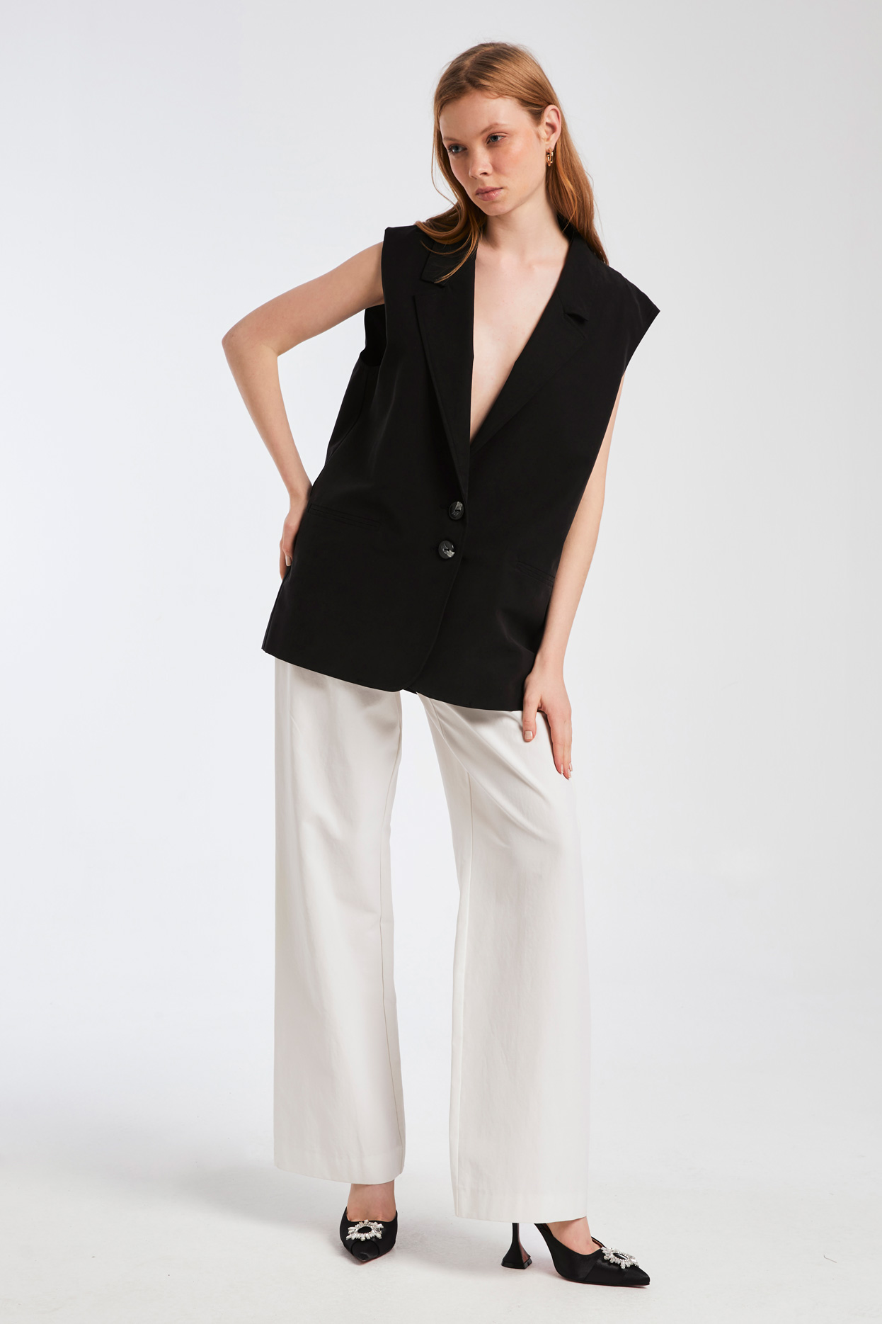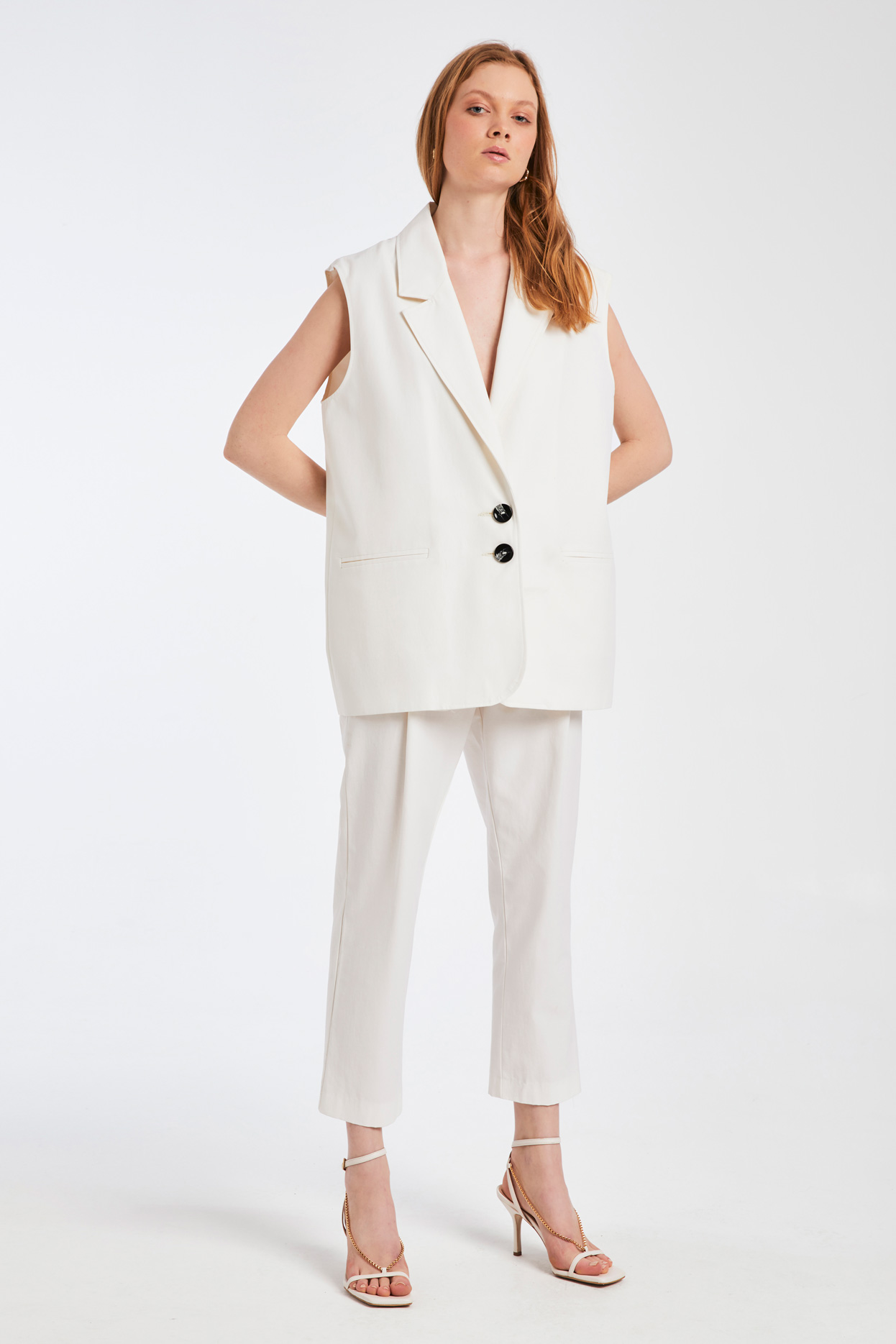 Μακρύ γιλέκο, Γιακάς και πέτα, 2 τσέπες εμπρός, Κλείσιμο εμπρός με δύο κουμπιά, Λεπτομέρεια με 2 κουμπιά στο πίσω μέρος και σκίσιμο,