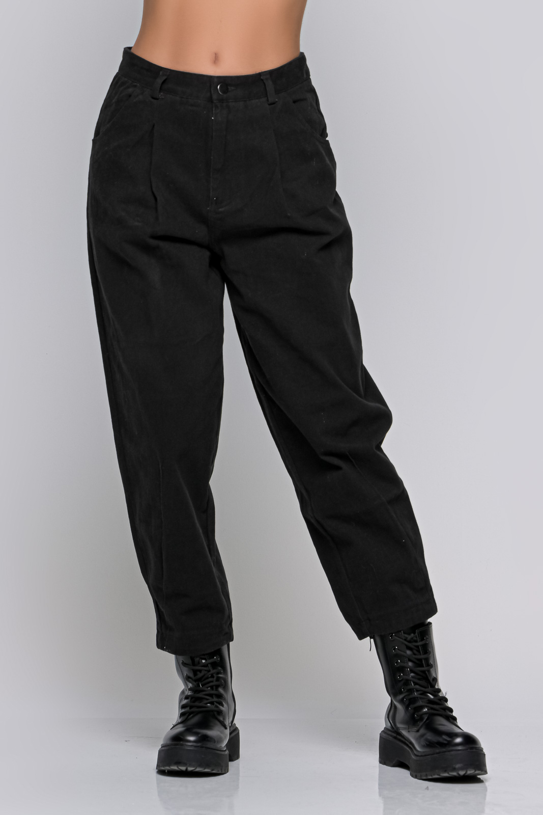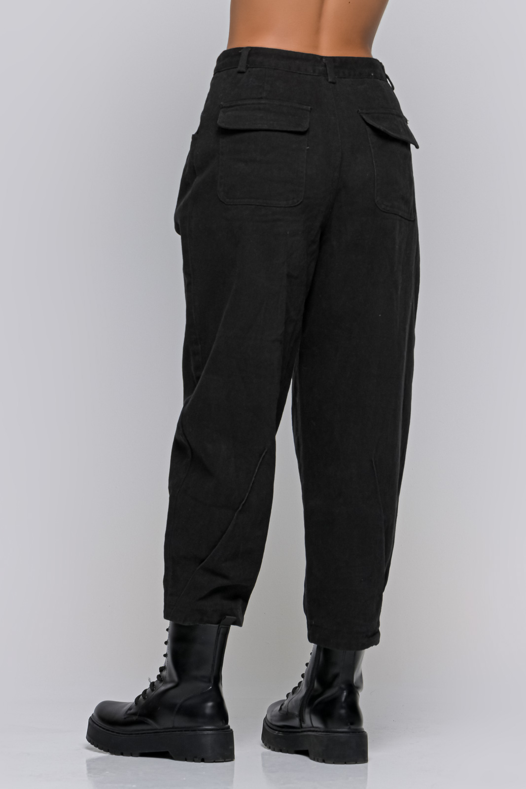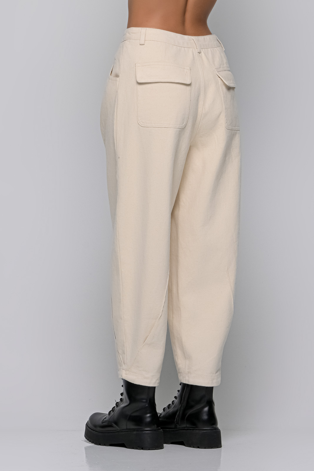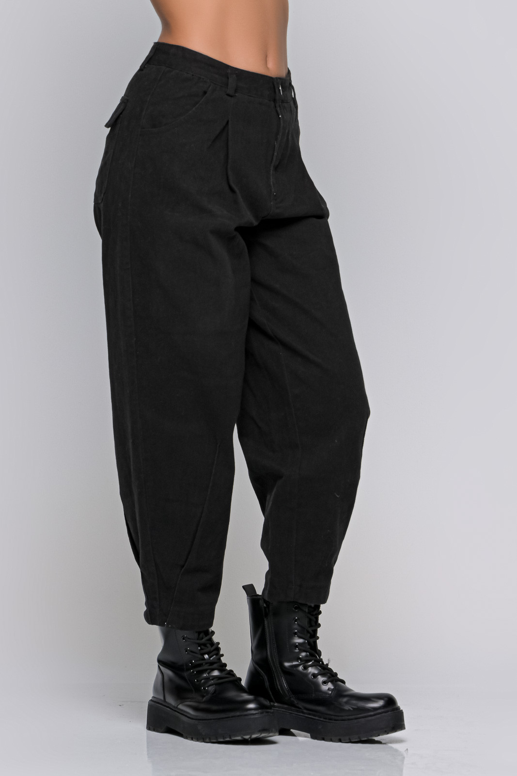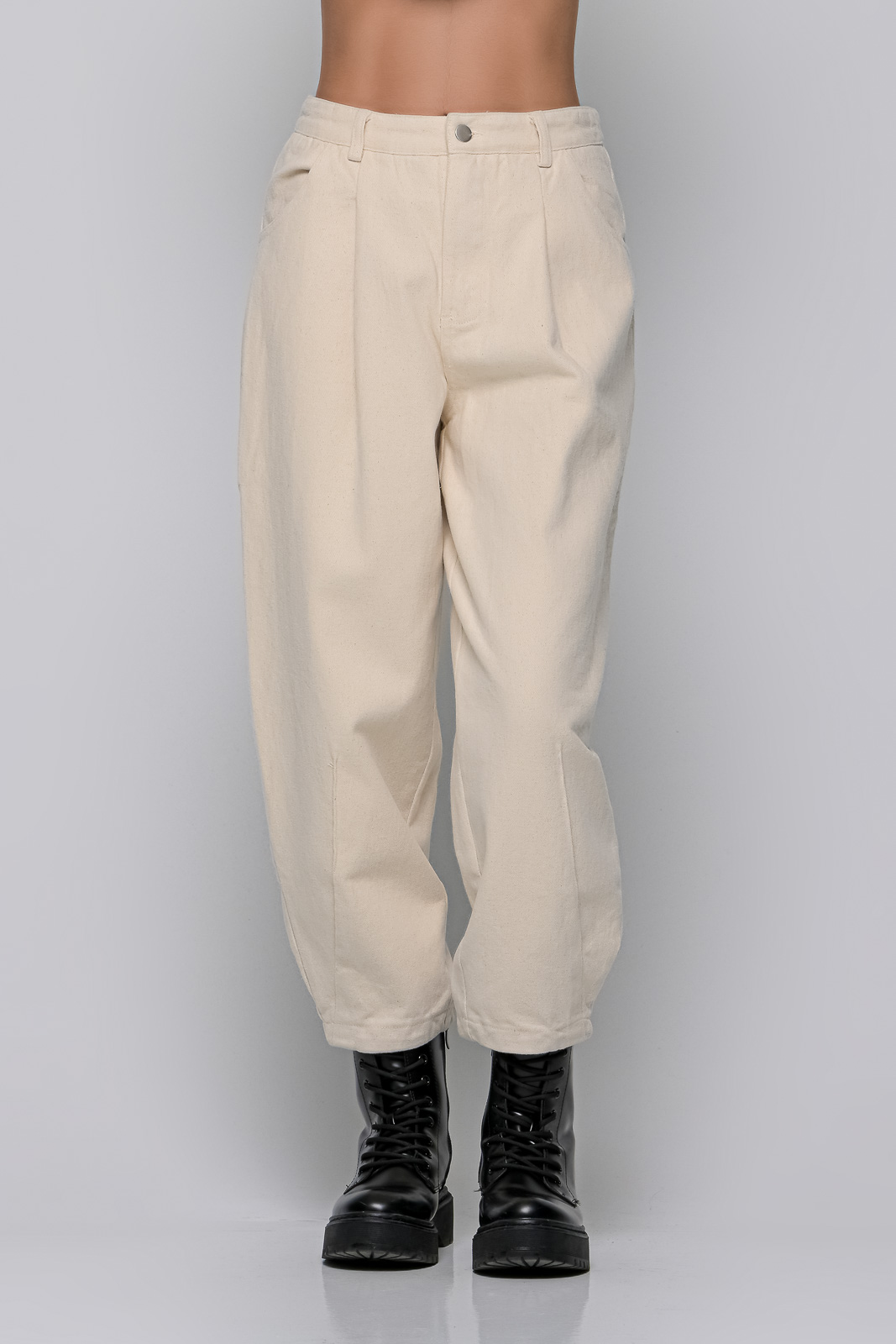 Παντελόνι με τζιν ύφανση με πιέτες και πλαϊνές τσέπες. Στενεύει στο τελείωμα, σε γραμμή baggy. Το μοντέλο είναι 1.68 και φοράει small. 100% ΒΑΜΒΑΚΙ