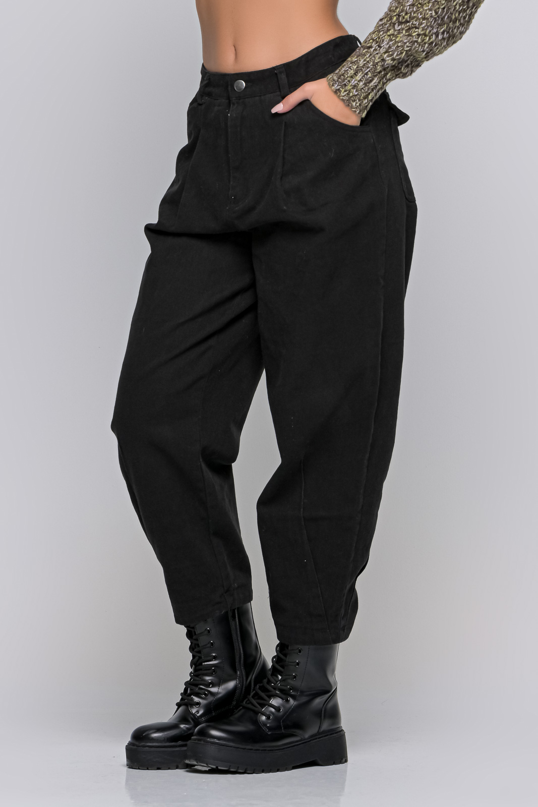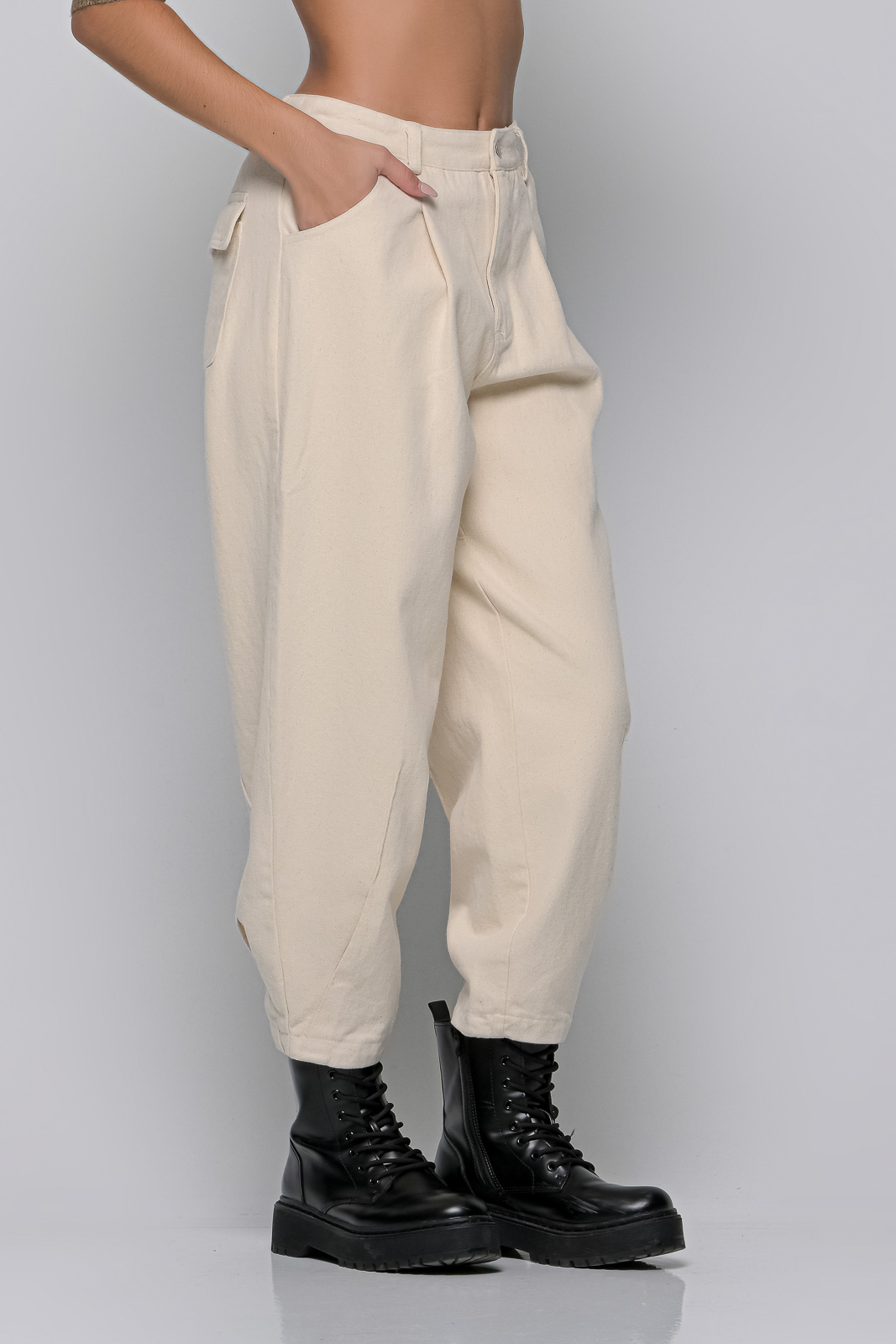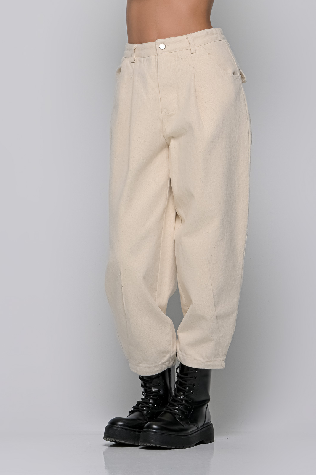 Παντελόνι με τζιν ύφανση με πιέτες και πλαϊνές τσέπες. Στενεύει στο τελείωμα, σε γραμμή baggy.